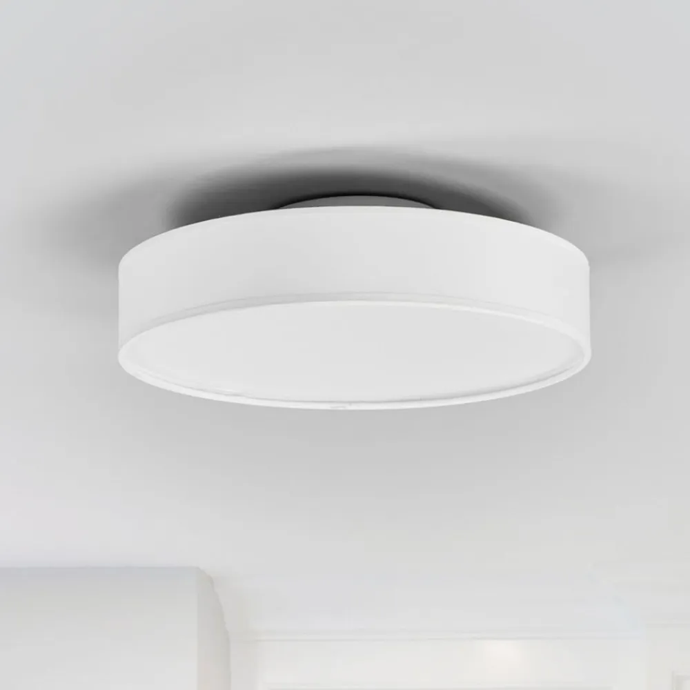 Rund LED-loftlampe Saira med hvid diffuser Stofloftlamper har altid været meget populære, fordi det lys, de giver, er særligt behageligt og meget hyggeligt. Den moderne version af en loftslampe i stof er udstyret med LED’er for at opnå førsteklasses energieffektivitet. LED’er scorer også point for deres lange levetid. Begge dele gælder også for Saira LED-stoflampen, hvis skærm er lavet af hvidt stof, mens undersiden er udstyret med en diffuser. Skærmens minimalistiske, runde form og dens hvide overflade gør Saira LED-stoflampen til en lyskilde, der kan bruges næsten universelt.