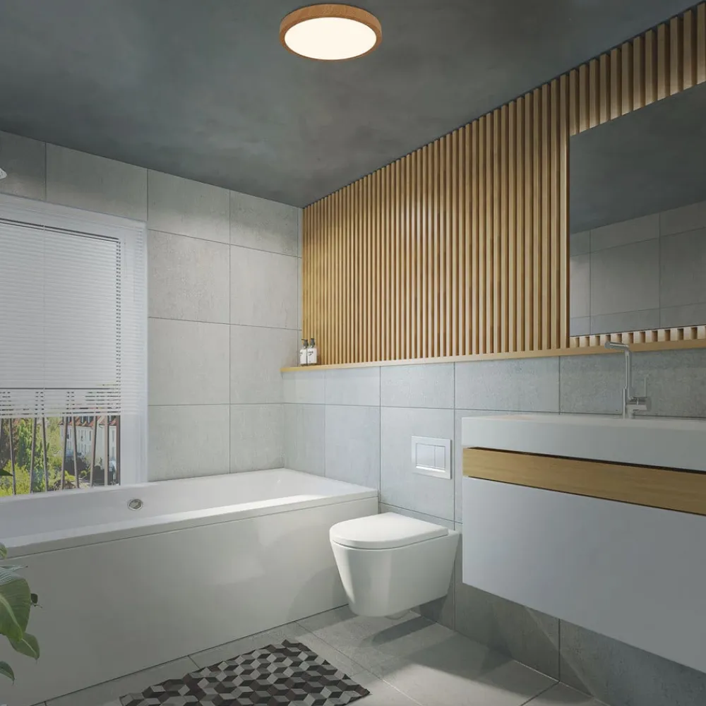 Flad LED-loftlampe Runa Wood med træfarvet metalramme