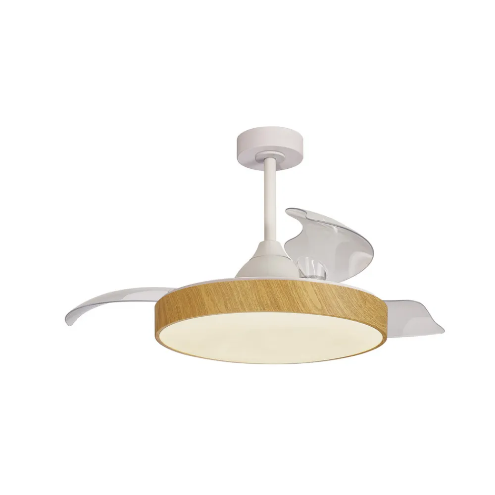 LED-loftventilatoren Alaska kombinerer en forfriskende brise med moderne almindelig belysning. De tre vinger af gennemsigtig plast er kun udfoldet, når ventilatoren er tændt, og skjules over den runde krop, når ventilatoren er slukket. Korpuset indeholder en kraftig LED-lampe, hvis lys kan dæmpes og reguleres i farvetemperaturen og spredes over et stort område nedad gennem en satineret afskærmning. Betjeningen foregår med den medfølgende fjernbetjening.