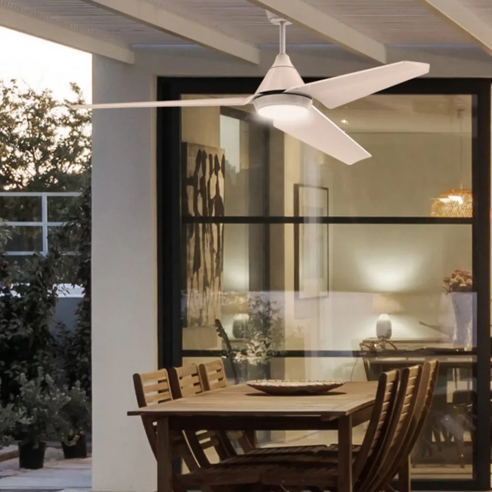 Inkluderet fjernbetjening: LED-loftventilator Bora til udendørs brug, dæmpbar, CCT, IP44 Dens kabinet er fremstillet af metal, mens de tre vinger er af plast. Den er helt hvid og leveres med fjernbetjening. Kan også bruges ved skærmarbejdspladser takket være en lav blændingsværdi (UGR<19).