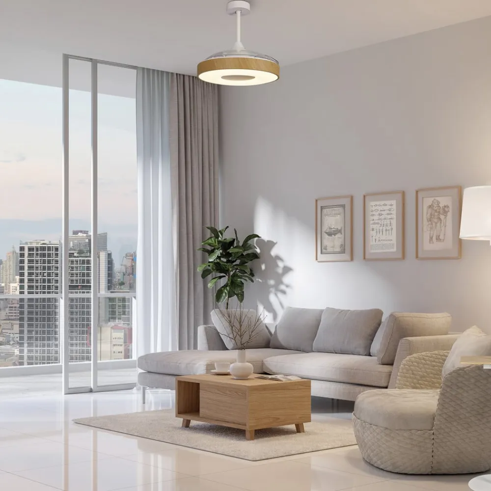 LED-loftventilatoren Coin Mini kombinerer en forfriskende brise med moderne almindelig belysning. De tre vinger af gennemsigtig plast er kun udfoldet, når ventilatoren er tændt, og skjules over den runde krop, når ventilatoren er slukket. Korpuset indeholder en kraftig LED-lampe, hvis lys kan dæmpes og reguleres i farvetemperatur og stråler ud over et stort område nedad gennem en satineret afskærmning. Betjeningen foregår med den medfølgende fjernbetjening.