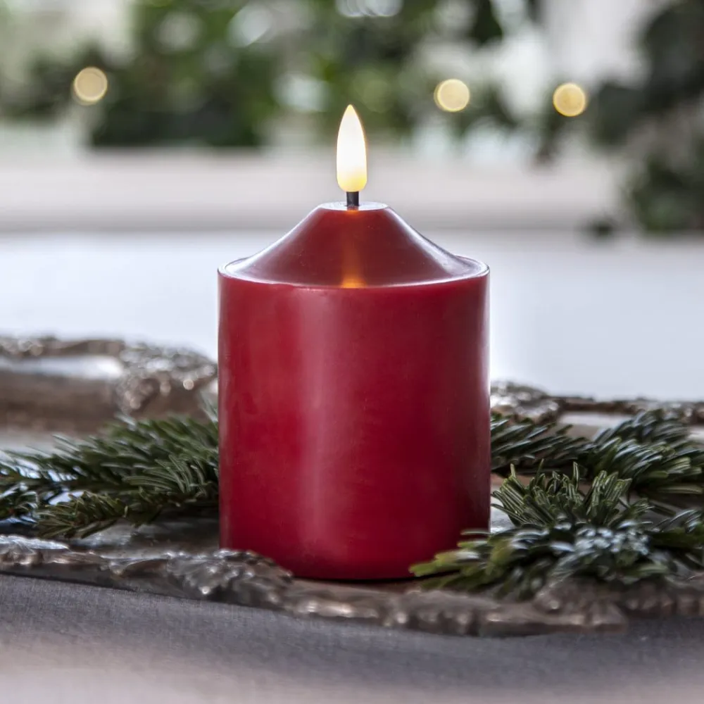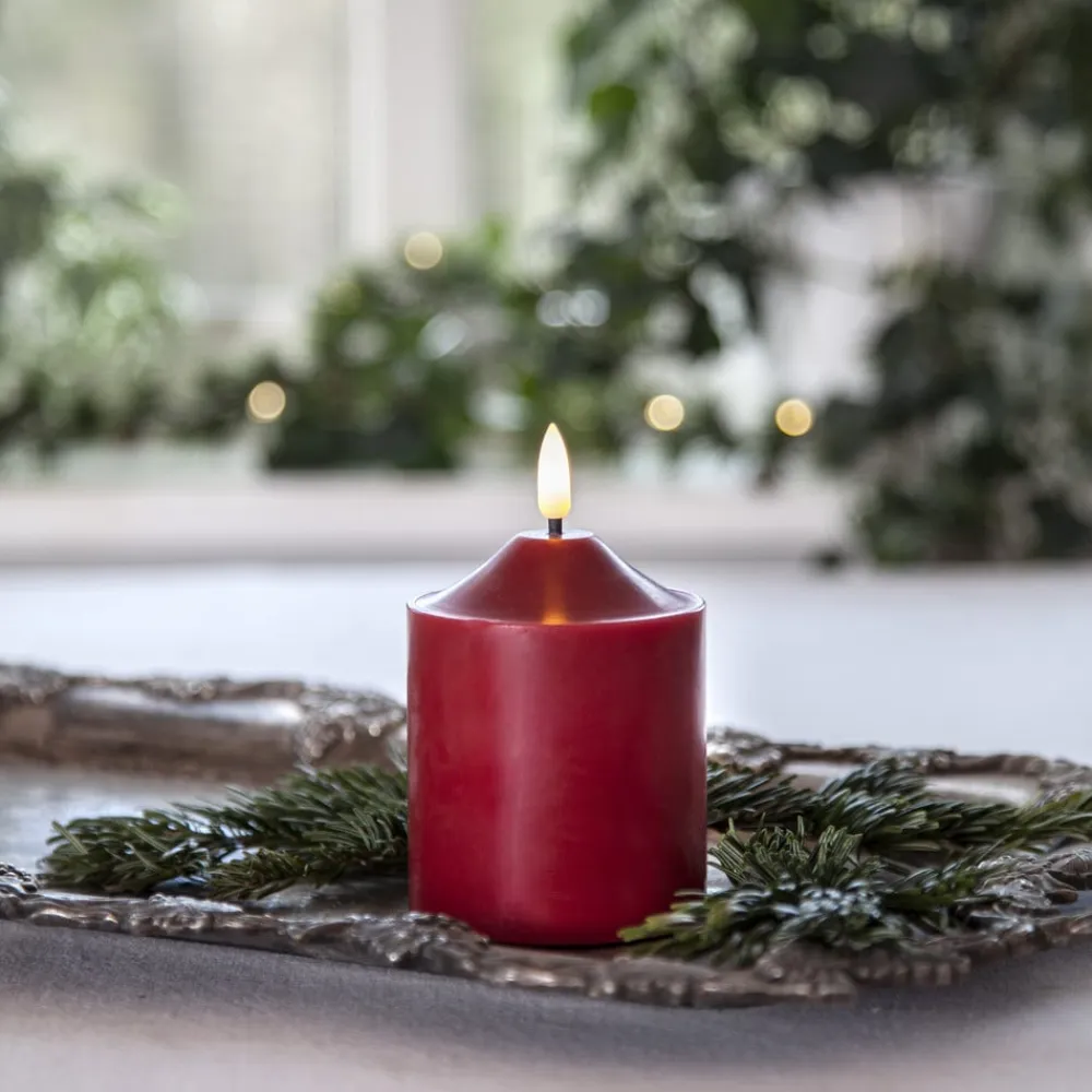 Batteridrevet LED-dekorationslys Flame af vinrød voks til indendørs brug – med timerfunktion LED-dekorationslyset Flame er et praktisk valg, især til juledekorationer i hjemmet. Dekorationslyset er lavet af ægte, vinrød voks i form af et klassisk bloklys. Det kan placeres hvor som helst takket være batteridriften (2 x AA – eksklusivt). Det kan tændes automatisk ved hjælp af en timer (6 timer tændt, 18 timer slukket).