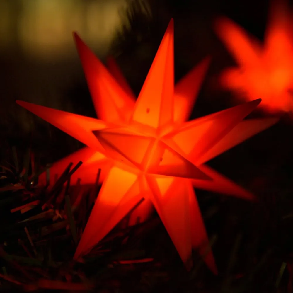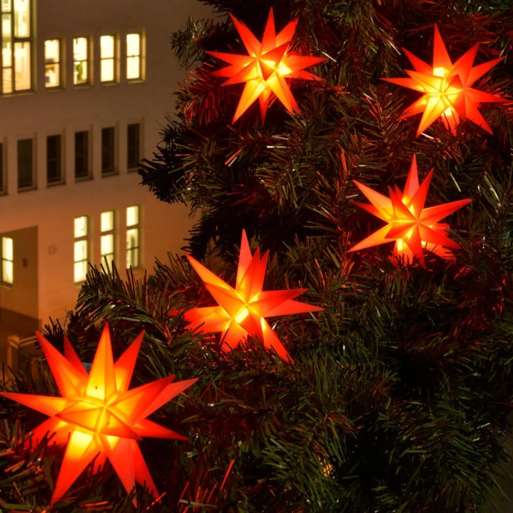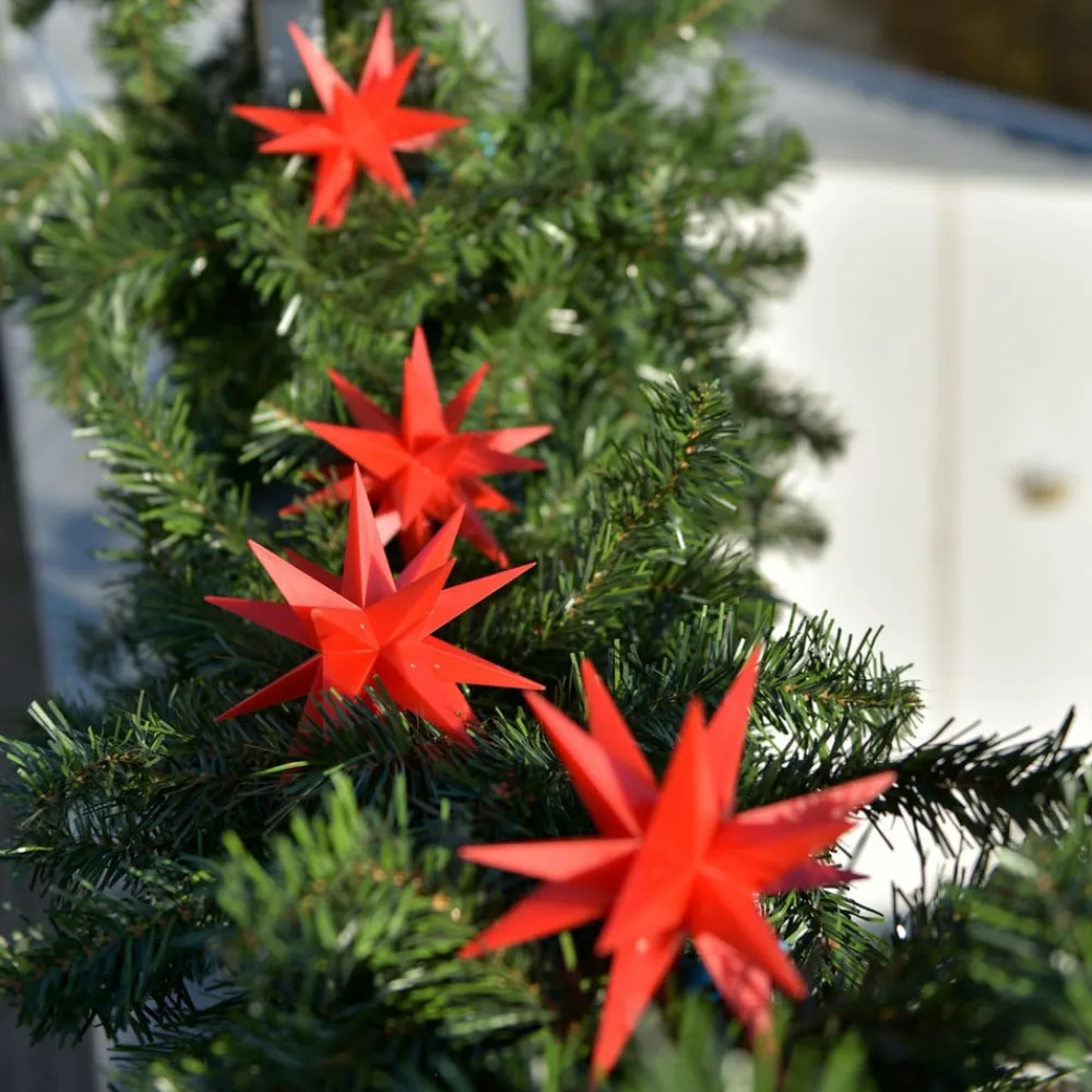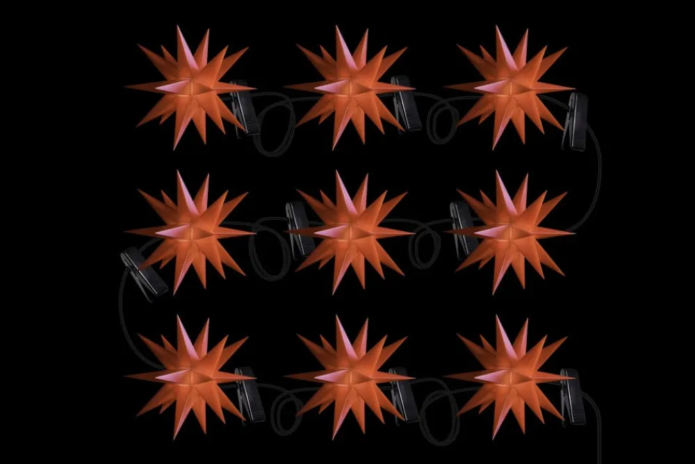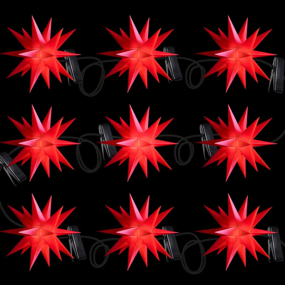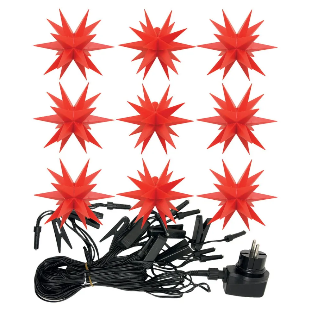 Denne lyskæde med ni røde 18-punkts stjerner i lille format er en juledekoration til indendørs og udendørs brug. Ministjernerne er placeret med 100 cm mellemrum og er fremstillet af vejrbestandigt plastik, der kan tåle selv frostgrader. En fantastisk juledekoration til at dekorere interiører eller terrassen, altanen eller haven. Leveringsomfanget omfatter klemmer til montering og en udendørs transformer.