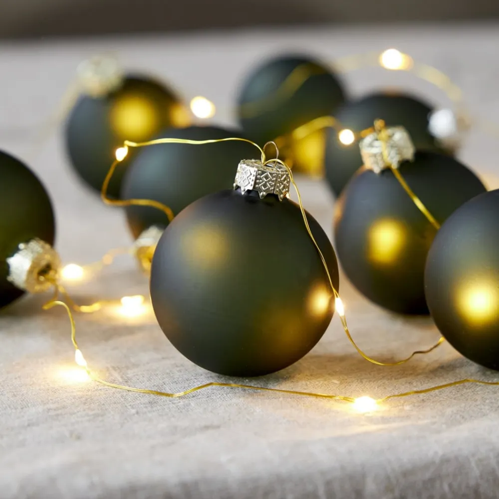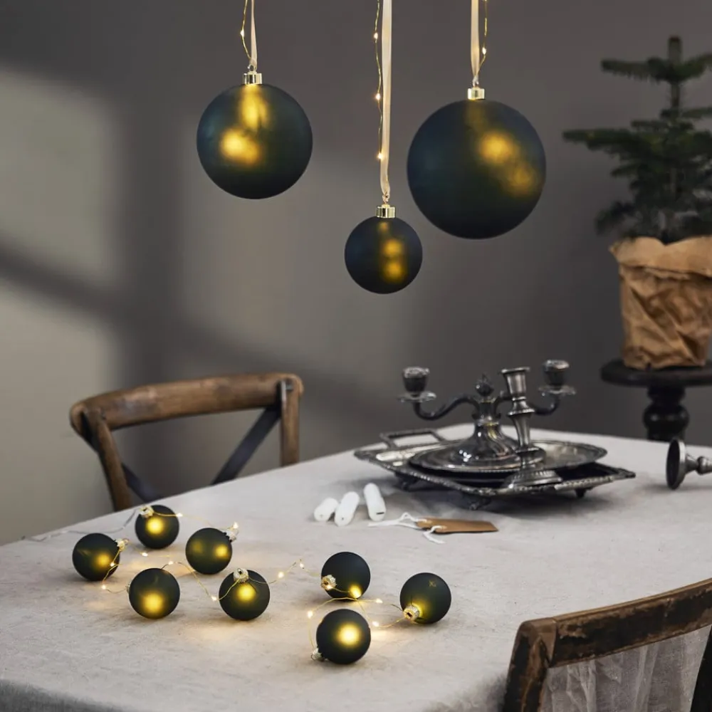 Batteridrevet Bliss LED-lyskæde med otte mørkegrønne glaskugler Bliss LED-lyskæden er en stemningsfuld lysdekoration til indendørs brug, især i juletiden. Otte kugleformede, mørkegrønne glas er stillet op langs kæden og indeholder hver en varmhvid LED. Strømmen kommer fra tre AA-batterier (eksklusive), som sættes i et batterirum for enden af kæden. Timerfunktionen (6 timer tændt, 18 timer slukket) gør det muligt at skifte automatisk.