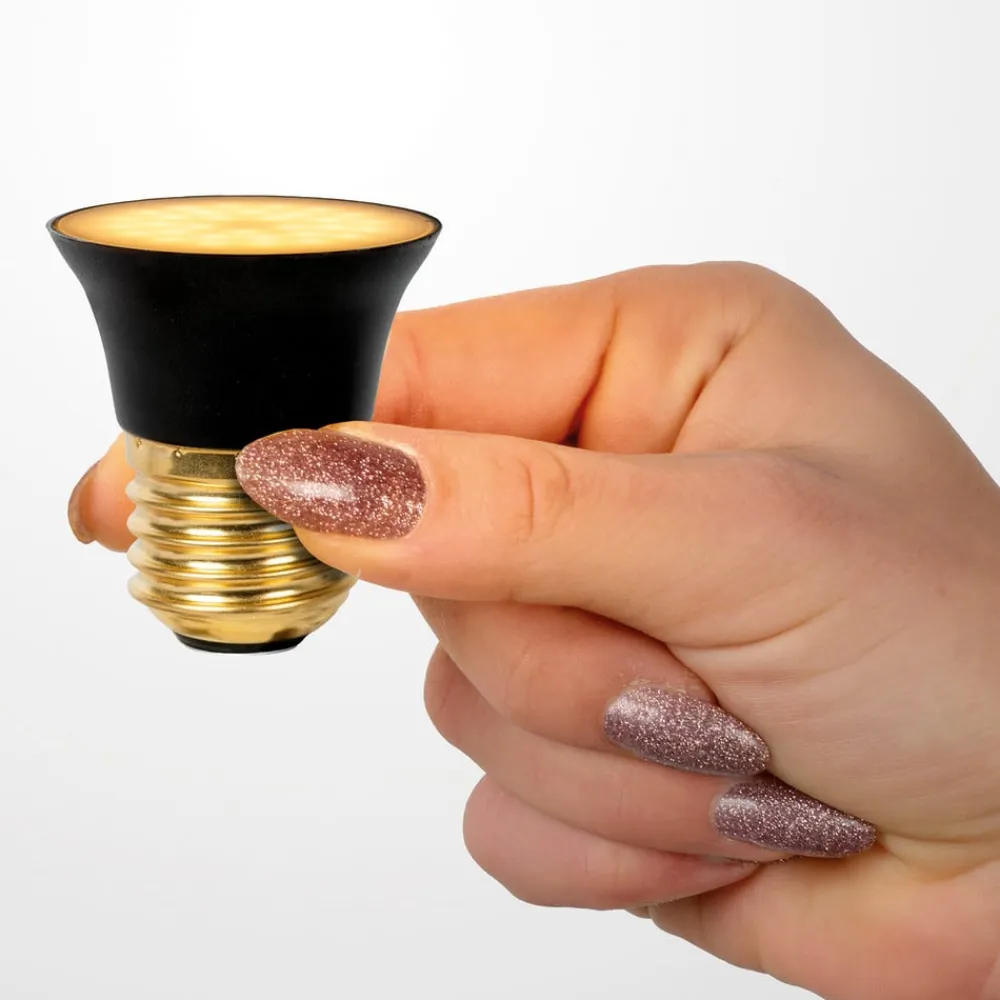Flad E27 LED-pære i G45-version, 5 watt, 3-StepDim Denne LED-pære med E27-sokkel har en flad form og kommer i et sort hus med gulddetaljer. Visuelt minder den om en reflektorpære. Dens varmhvide lys med 400 lumen kan justeres i lysstyrke takket være 3-trins dæmpningsfunktionen.