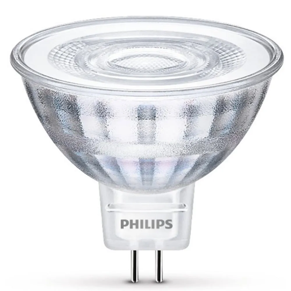 Visuelt ligner GU5.3 LED-reflektoren en lavspændingshalogenreflektor, men den kræver kun en brøkdel af energien for et tilsvarende lysudbytte og har en meget længere levetid. Med sin universelle hvide lysfarve på 4.000 K er lampen særlig velegnet til alle områder, hvor der ønskes en træthedsfri belysning.