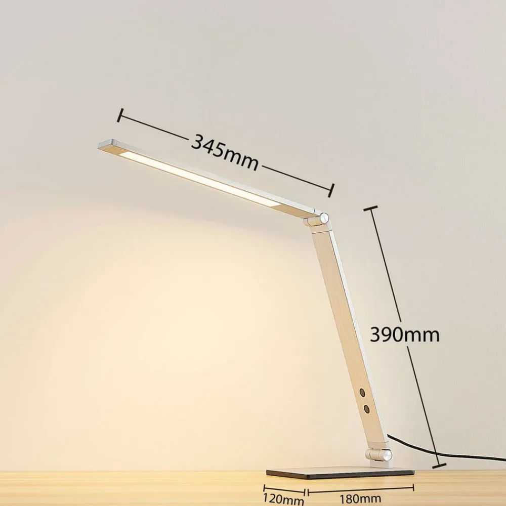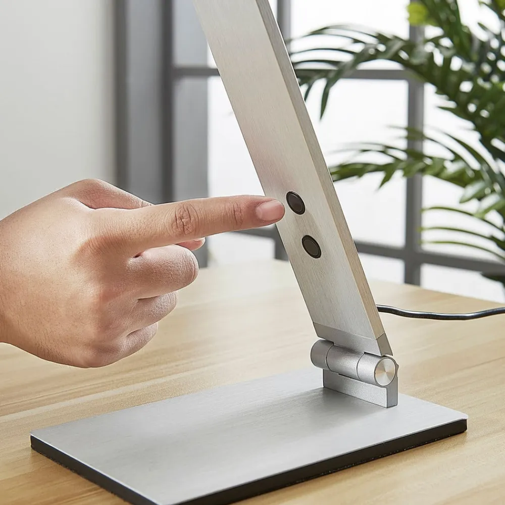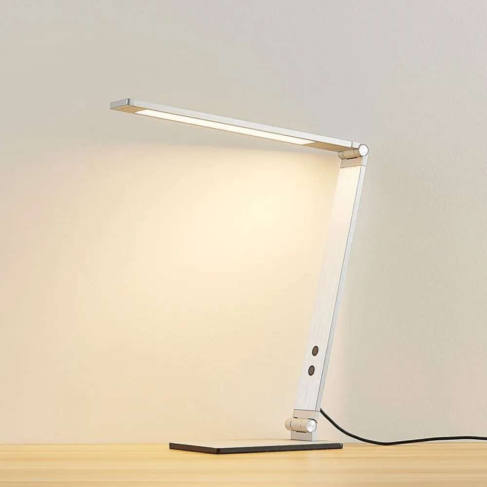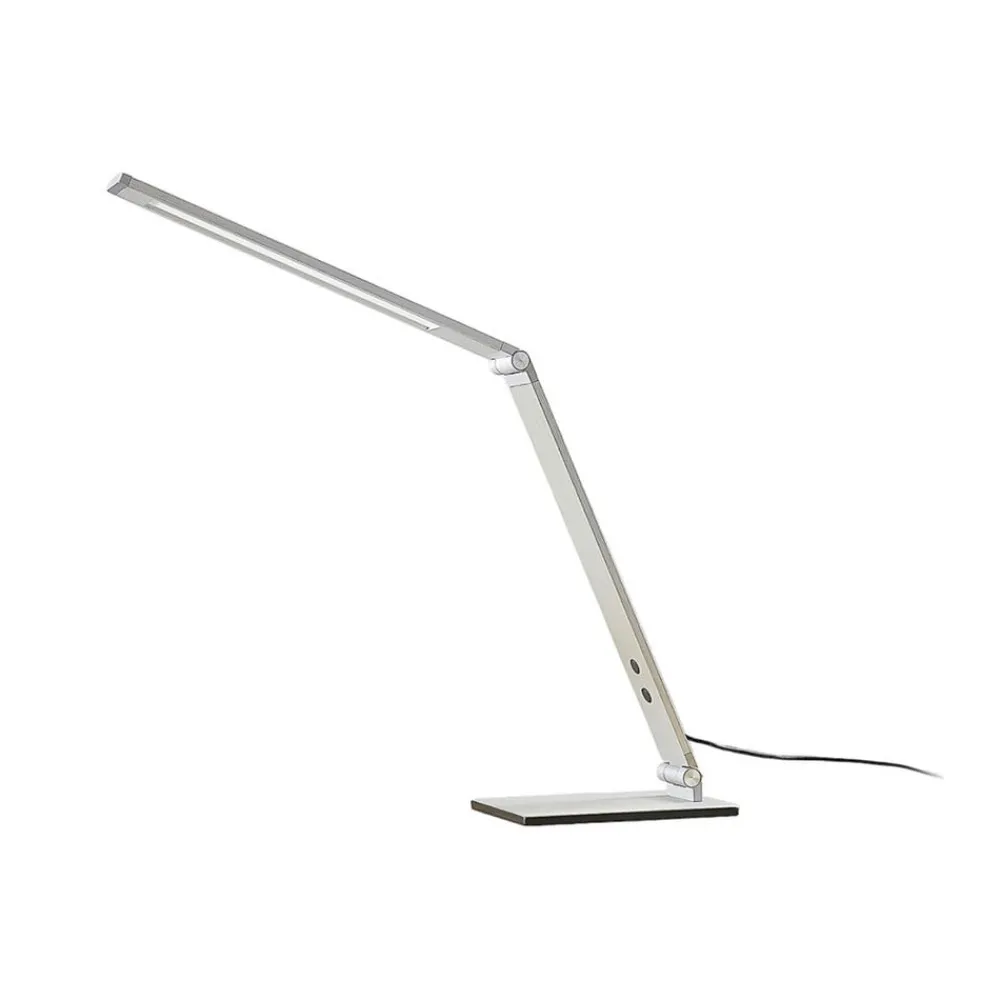 Moderne LED-skrivebordslampe Nicano af aluminium, lysfarve og lysstyrke kan justeres i fire trin Nicano er en meget nyttig tilføjelse til skrivebordet med et moderne look. LED-skrivebordslampen består af en kantet lampefod og to aflange elementer, hvoraf det øverste er belysningselementet. Alle elementer er forbundet med hinanden med led og kan derfor flyttes op og ned, så lysstrålens retning kan bestemmes individuelt. Lysfarven og lysstyrken på LED’erne kan også justeres, og der er mulighed for fire niveauer i hvert tilfælde.