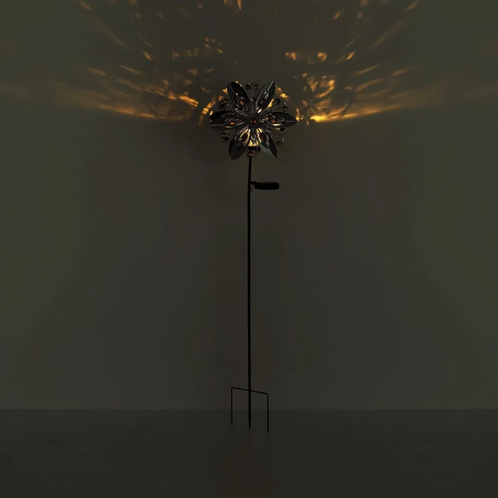 LED-solcellelampe 36578S i blomsterdesign med jordspyd Denne solcellelampe med jordspyd i filigran blomsterdesign består af to metalblomster med en sølvfarvet overflade på forsiden og en sort overflade på bagsiden, som er dekoreret med gule glassten. Mellem de to blomster er der en klar glaskugle med en varmhvid LED – med afbryder på solcellemodulet