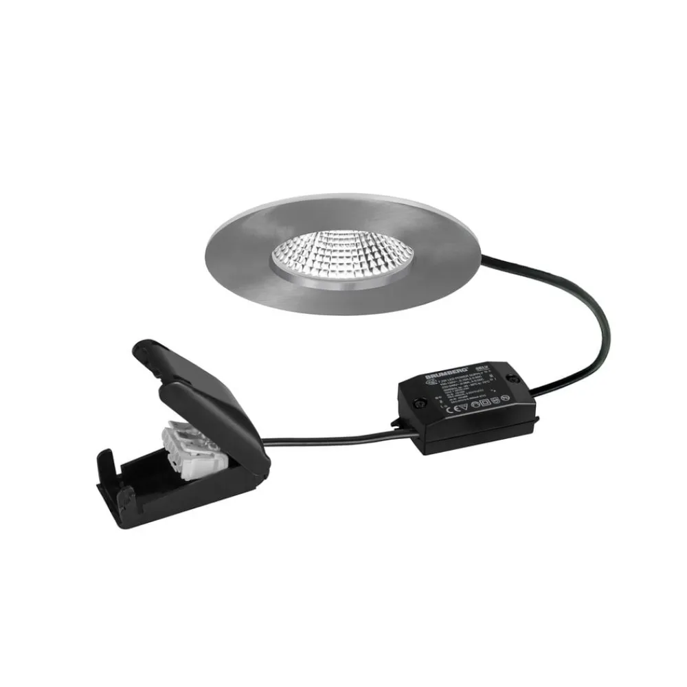 BB20 IP65 LED-indbygningsspot med omskiftelig LED-driver og tilslutningsboks Badeværelser, wellnessområder og mange andre fugtige rum i den private eller kommercielle sektor kan udstyres med BB20 LED-downlight, som er støvtæt og beskyttet mod vandstråler med IP65-beskyttelse. Den kan monteres uden værktøj ved hjælp af installationsfjedre, kan installeres i lofttykkelser på op til 1,7 cm og er ikke dæmpbar. Downlighten udsender varmhvidt lys, som udsendes i en vinkel på 36° og fordeles optimalt af sølvreflektoren med rotationssymmetrisk dybstrålende lysfordeling gennem den gennemsigtige plastafdækning.