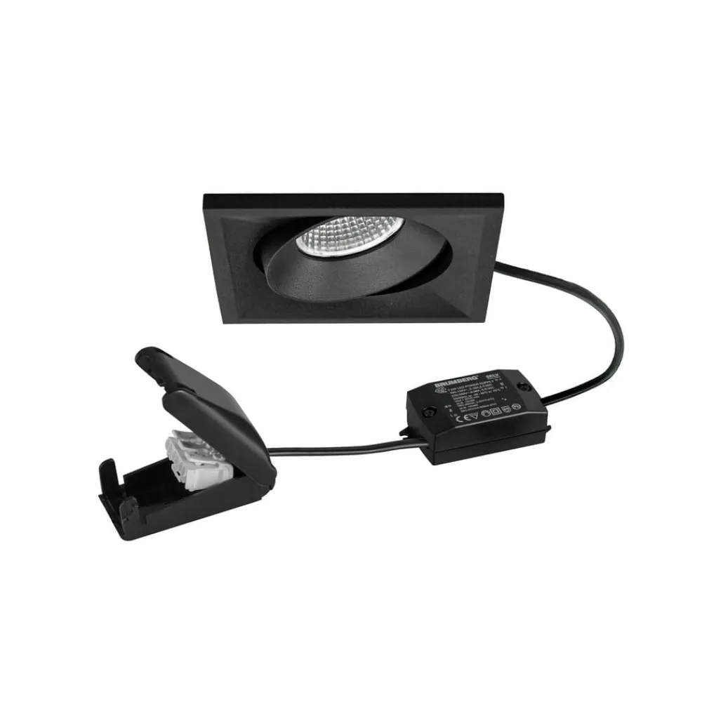 Indbygget LED-spot BB38 med elektronisk tænd/sluk-betjening og tilslutningsboks BB38 er et indbygget LED-spot med en firkantet ramme, der kan drejes 20° rundt og er fremstillet af aluminium med en transparent polykarbonatafdækning. Den leveres klar til tilslutning til 230 V som et komplet sæt med en elektronisk, omskiftelig styring og en tilslutningsboks og kan ikke dæmpes. Installation i lofter med en maksimal tykkelse på 1,5 cm kan udføres uden værktøj takket være installationsfjedre. Udstyret med en sølvfarvet reflektor med rotationssymmetrisk, smal- og bredstrålende lysfordeling og transparent afdækning garanteres højt lysudbytte og optimal lysfordeling – inkl. elektronisk tænd/sluk-betjening, ikke dæmpbar – inkl. tilslutningsboks, 3-polet til gennemfortrådning – tilladt omgivelsestemperatur (ta): -20 °C – +25 °C – spot kan drejes 20° hele vejen rundt – maksimal loftstykkelse 1,5 cm