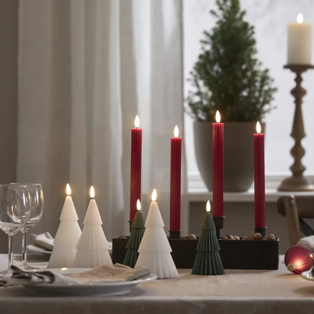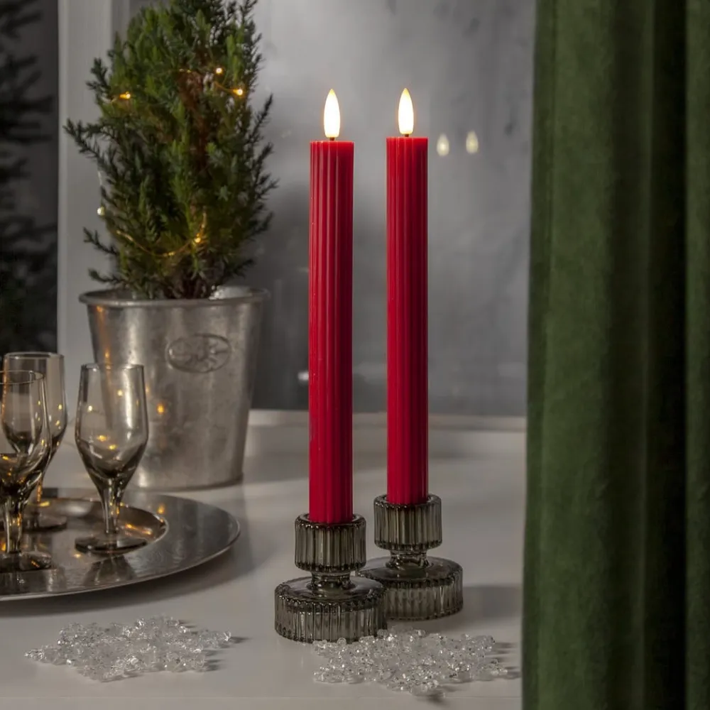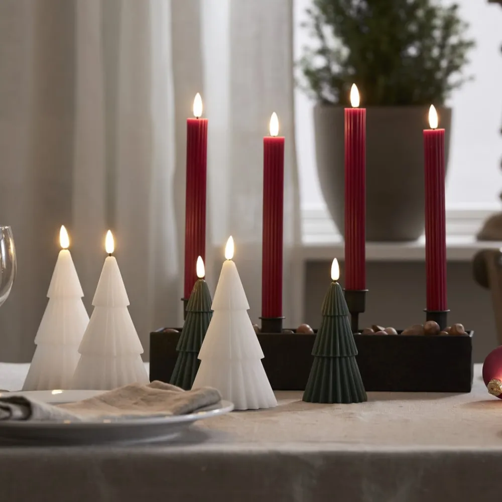 Sæt med 2 – batteridrevet Flamme Stripe LED-dekorationslys til indendørs brug – med timerfunktion Flamme Stripe LED-stearinlyset er et praktisk valg, især til juledekorationer i hjemmet. Dekorationslyset er lavet af ægte voks i en slank, riflet form. Det kan placeres hvor som helst takket være batteridriften (2 x AAA – eksklusivt). Det kan tændes automatisk ved hjælp af en timer (6 timer tændt, 18 timer slukket). Der medfølger to stearinlys.