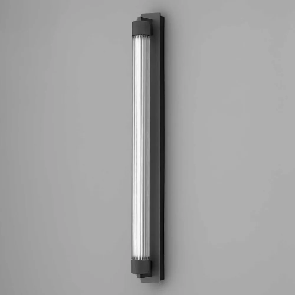 Den rektangulære vægbeslag er fremstillet af jern og aluminium og har en cylindrisk diffusor, der er omgivet af riflede hovedstykker. Borosilikatglasset har et fint, lige rillemønster.
