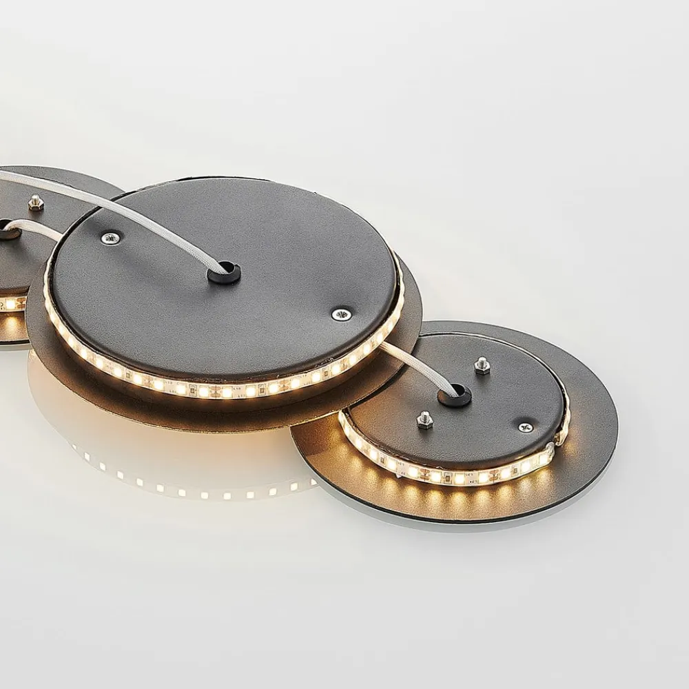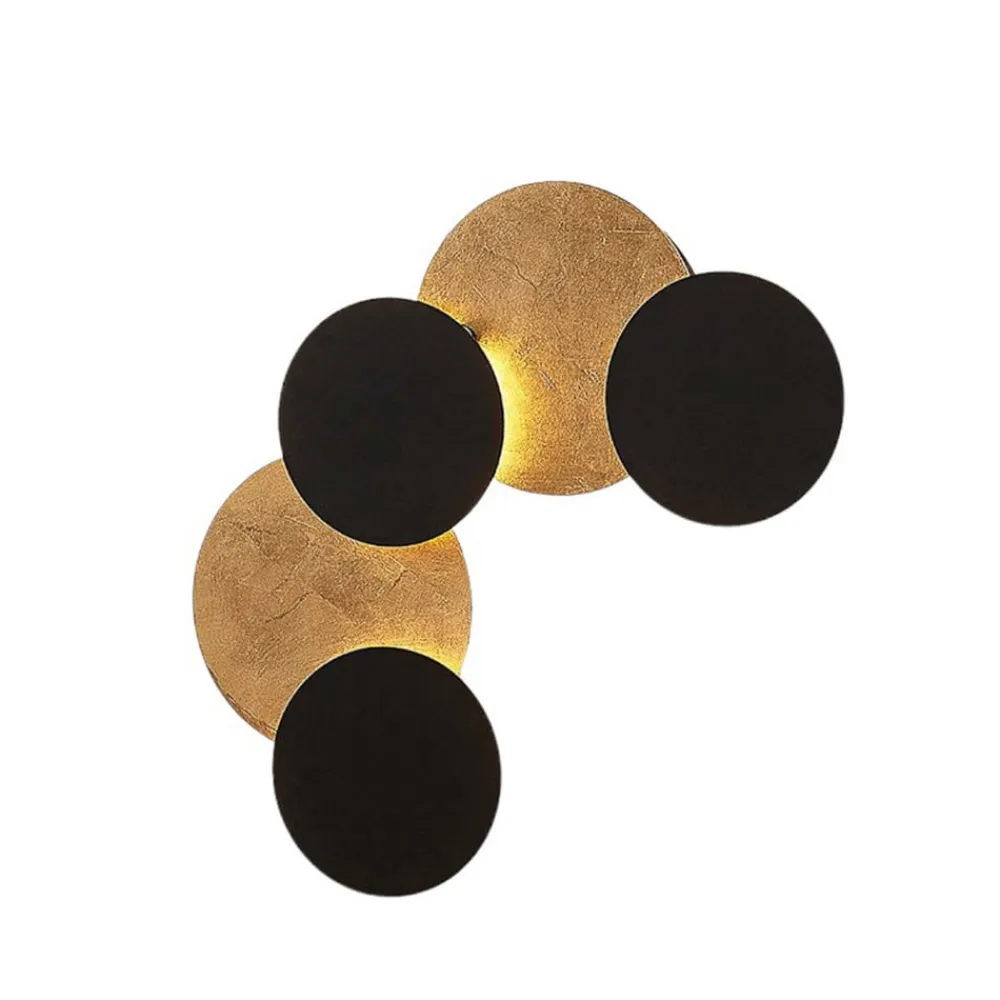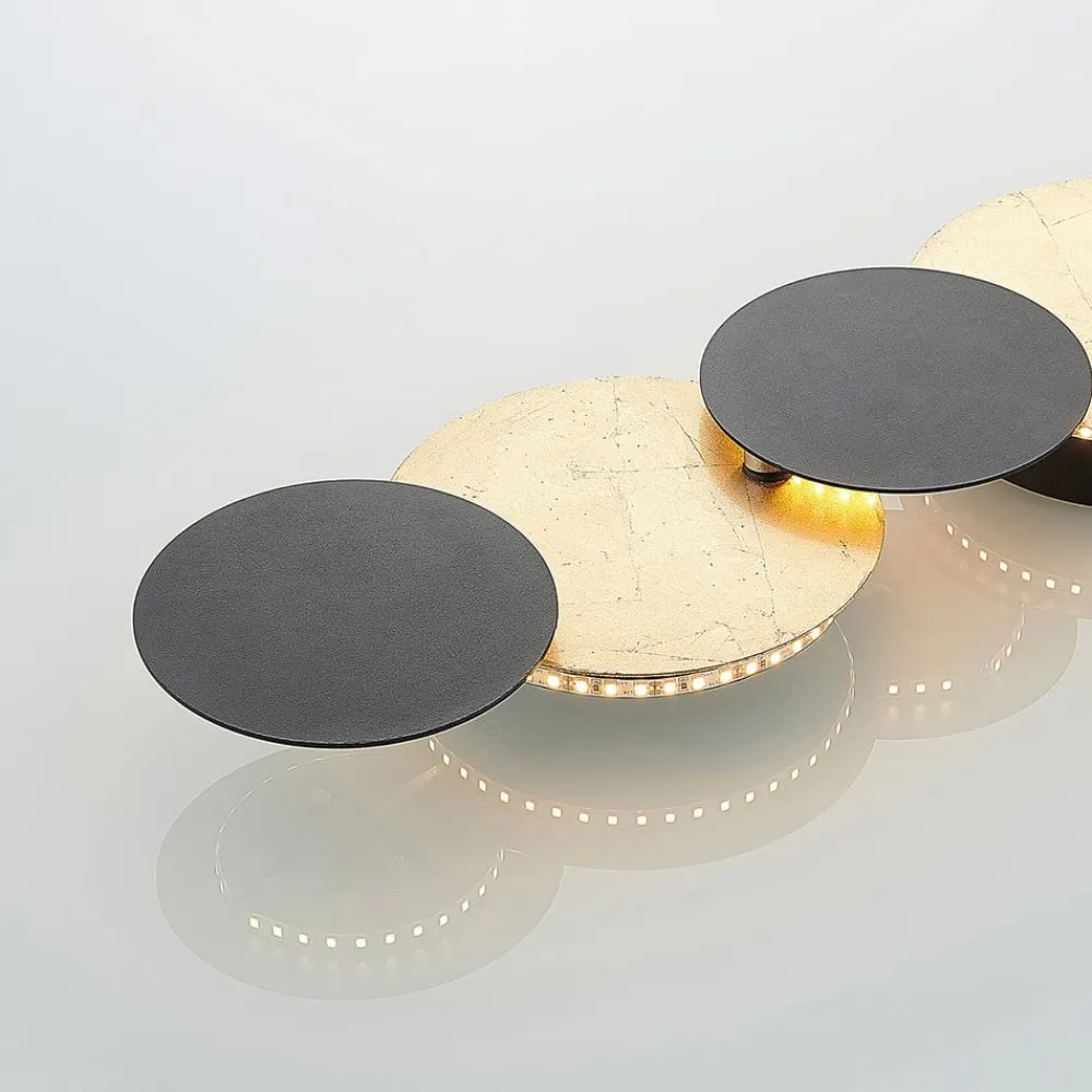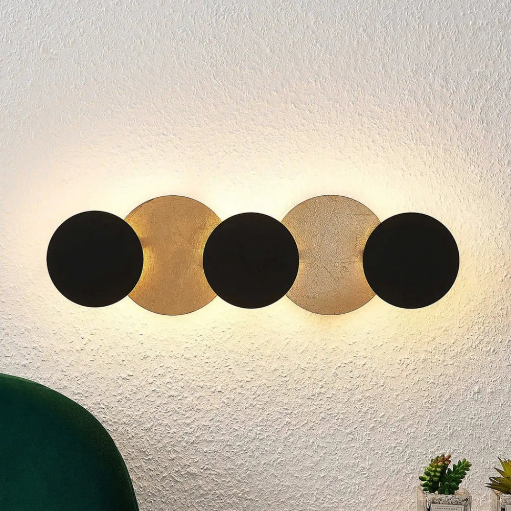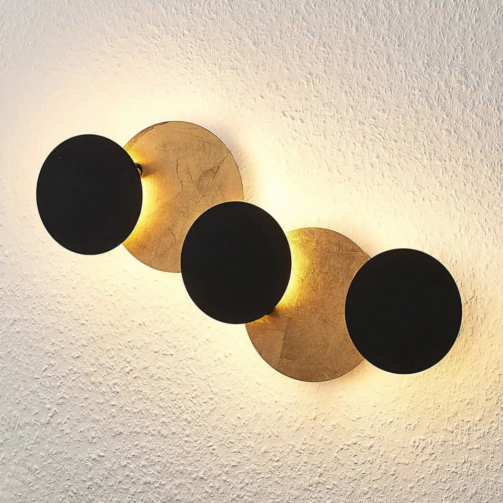 Sort og guld i dekorativ harmoni – Grazyna LED-væglampe Den sorte og gyldne Grazyna-væglampe, som er udstyret med energieffektive LED’er på bagsiden, ligner en moderne vægdekoration. Det betyder, at man ikke ved første øjekast opdager, at der er tale om en indirekte lyskilde. Monteret på væggen giver Grazyna en blød, behagelig belysning med et varmhvidt lys, når den er tændt. Kontrasten mellem sort og guld fremhæves endnu mere og giver næsten indtryk af et 3D-billede. Grazyna LED-væglampen er velegnet til brug i moderne opholdsrum, hvad enten det er i stuen, spisestuen eller gangen. Grazyna er også et armatur, der kan monteres i loftet.