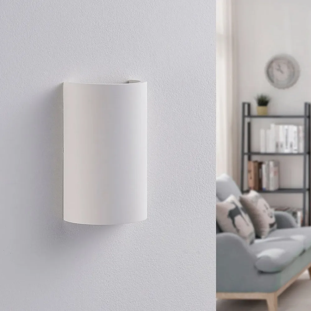 Jenke halvcirkelformet LED-væglampe i gips med dobbelt lysudsendelse og malbar overflade Gipskroppen på denne væglampe er helt hvid, hvilket skaber en særlig harmonisk effekt. Da mange vægoverflader er hvide, er armaturet ideelt til tone-i-tone-arrangementer. Det gælder i øvrigt også, hvis væggen allerede er malet i en bestemt farve, da gipsoverfladen kan males på samme måde som de fleste vægoverflader og kan males i den ønskede farve på ingen tid. LED’erne, som er skjult bag den halvcirkelformede afdækning, kan lyse opad og nedad på en blød, flydende måde takket være Jenkes design og er blandt de mest energibesparende lyskilder i moderne design.