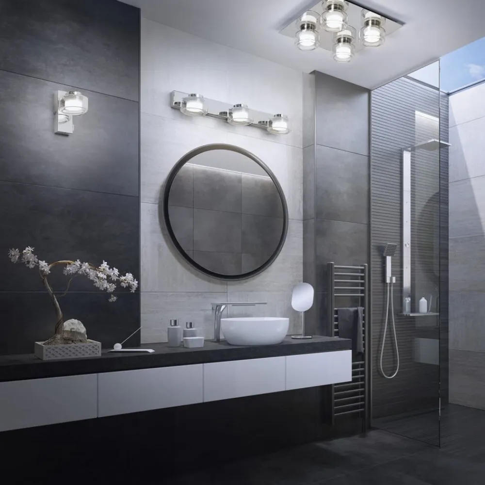 Orbis Flame IP44 LED-væglampe, 2 lysfarver kan vælges Orbis Flame er en 2 lyskilder LED-væglampe, der er perfekt til badeværelser takket være sin kapslingsgrad på IP44. Det smukt designede armatur med et kantet vægbeslag i aluminium og to gennemsigtige glasskærme er udstyret med en kontakt, der kan bruges til at vælge lysfarve. Når den tændes én gang, lyser den i en varmhvid lysfarve; når den tændes to gange inden for tre sekunder, lyser den i en universalhvid lysfarve.