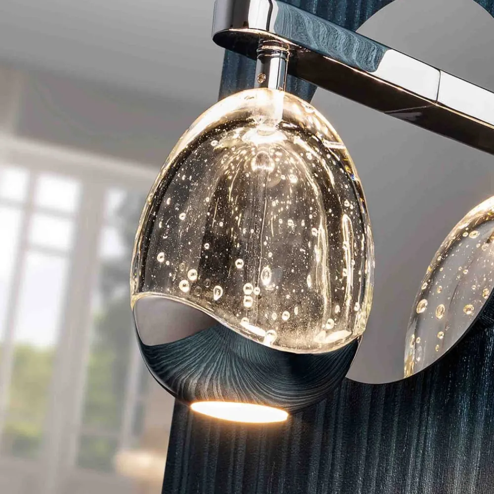Rocio LED-væglampe med dråbeformet glasskærm Den dråbeformede skærm på Rocio-væglampen er fastgjort til et blankt, ovalt beslag med en konsol og rettet nedad. Glasset med sine bobleindeslutninger og skinnende metalapplikation i bunden afslører sin fulde skønhed, når lyset er tændt, og skaber interessante lyseffekter, mens lyset sendes direkte nedad gennem åbningen.
