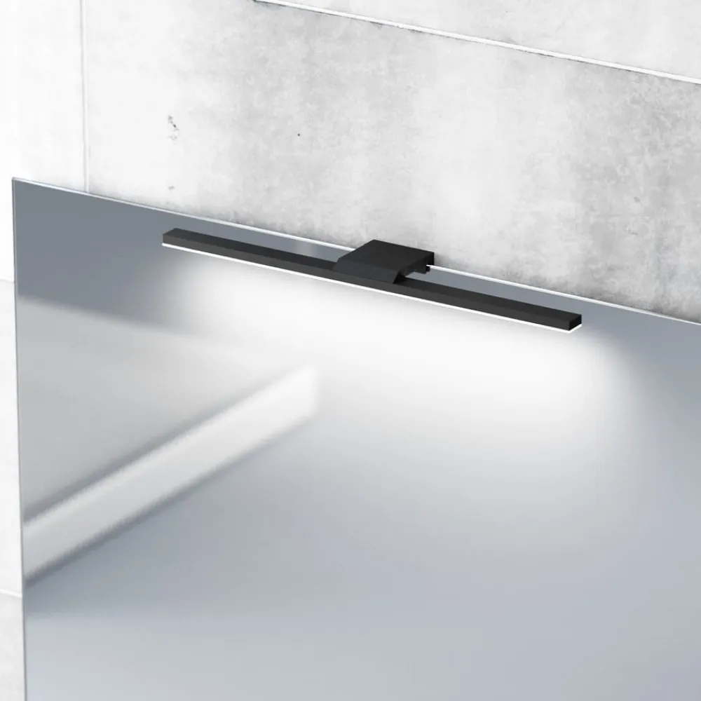 Sort Modena LED-spejllampe til badeværelset Modena LED-væglampen i sort er en moderne lyskilde, der er udstyret med et beslag til fastgørelse på spejlkanter. Det universelle hvide lys fra de integrerede LED’er sendes nedad og giver en god belysning af spejle og håndvaske – Beskyttelsesgrad: IP44