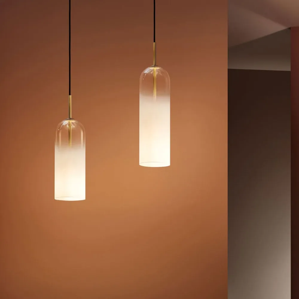Glam pendellampe med hvidt glas og gyldne detaljer Glam pendellampen i glas beriger det moderne interiør med sit elegante design, uanset om det er en privat stue eller en restaurant. Skærmen er udformet som en cylinder, der er lukket i toppen og lader lyset slippe uhindret ud gennem åbningen i bunden – ideelt til direkte bordbelysning. Den nederste del af glasset er hvidt og uigennemsigtigt, mens den øverste del blidt går over i en klar sektion. Her kan du se den gyldne stang, der holder den nedadvendte fatning og fungerer som indgang til det sorte kabel i toppen.