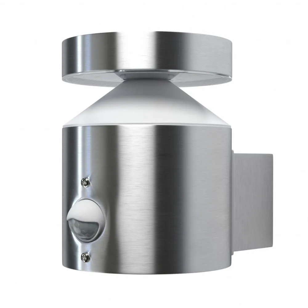Rustfrit stål af høj kvalitet omgiver den varme hvide polycarbonatlampe, hvis lys skaber en behagelig atmosfære. Væglampen kombinerer en raffineret dekoration og en perfekt funktionalitet. Den cylindrisk formede væglampe har en praktisk dagslysregistrering, så den kun tændes, når det langsomt bliver mørkt udenfor.