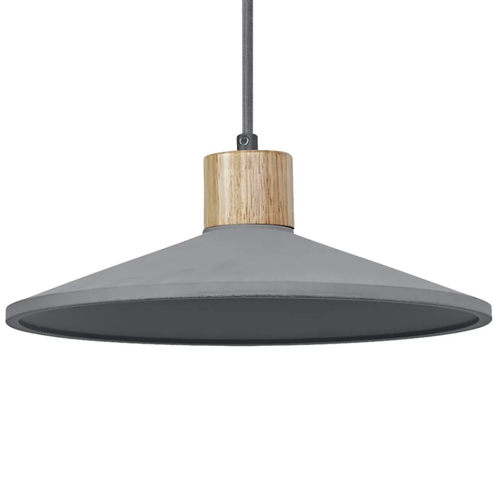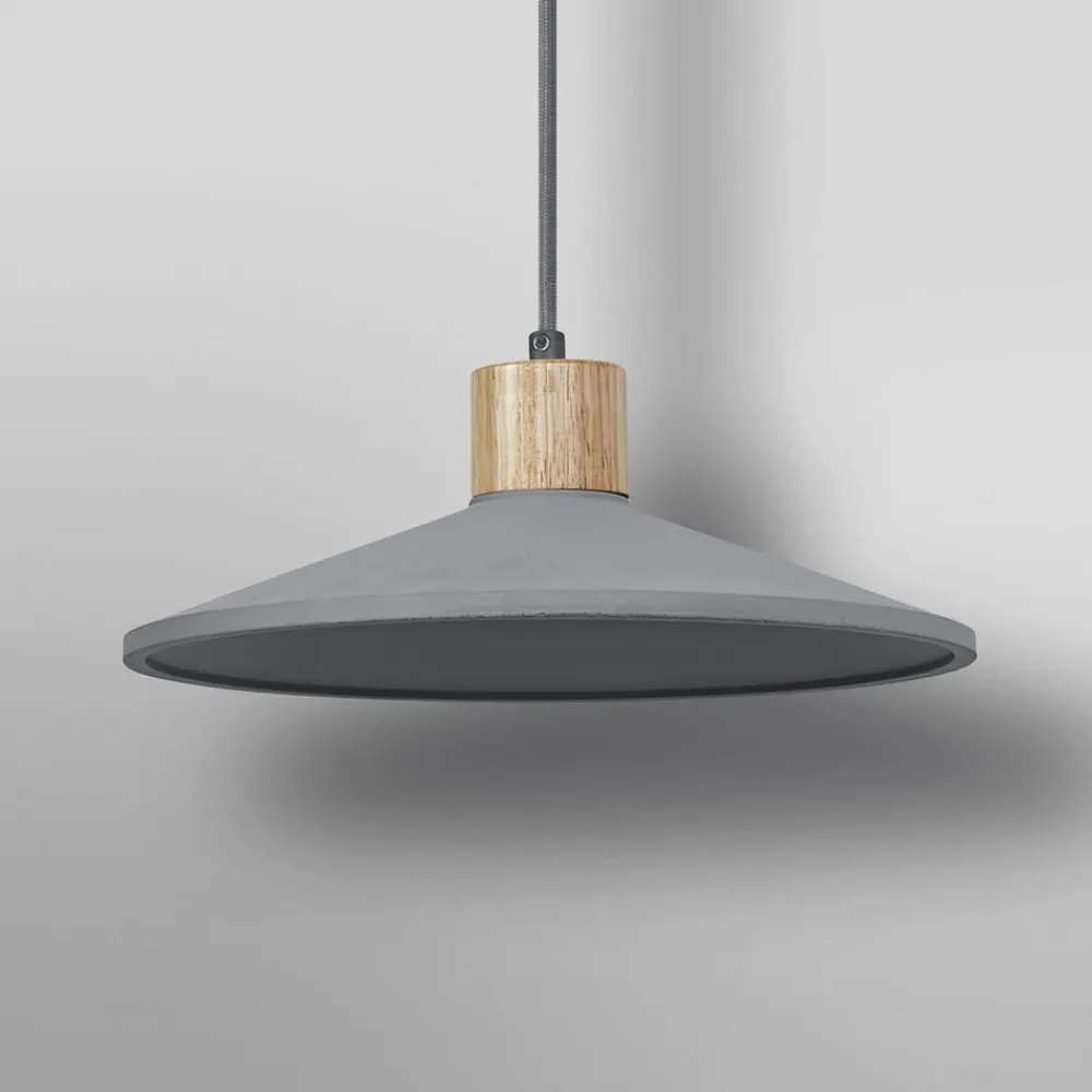 Concrete Wood hængelampe med betonskærm og træelement Concrete Wood hængelampen i betondesign giver en særlig atmosfære til ethvert rum. Den er perfekt til at belyse spiseborde eller køkkenborde. Armaturets brede skærm af beton i høj kvalitet er dekoreret med et træelement ovenover, hvilket giver armaturet en særlig effekt takket være denne kombination af materialer. De klare linjer og det robuste materiale understreger den moderne karakter af young living og skaber en smuk atmosfære. Hængelampen er udstyret med en E27-fatning, så lyskilden kan vælges efter det ønskede lys og udskiftes til enhver tid.