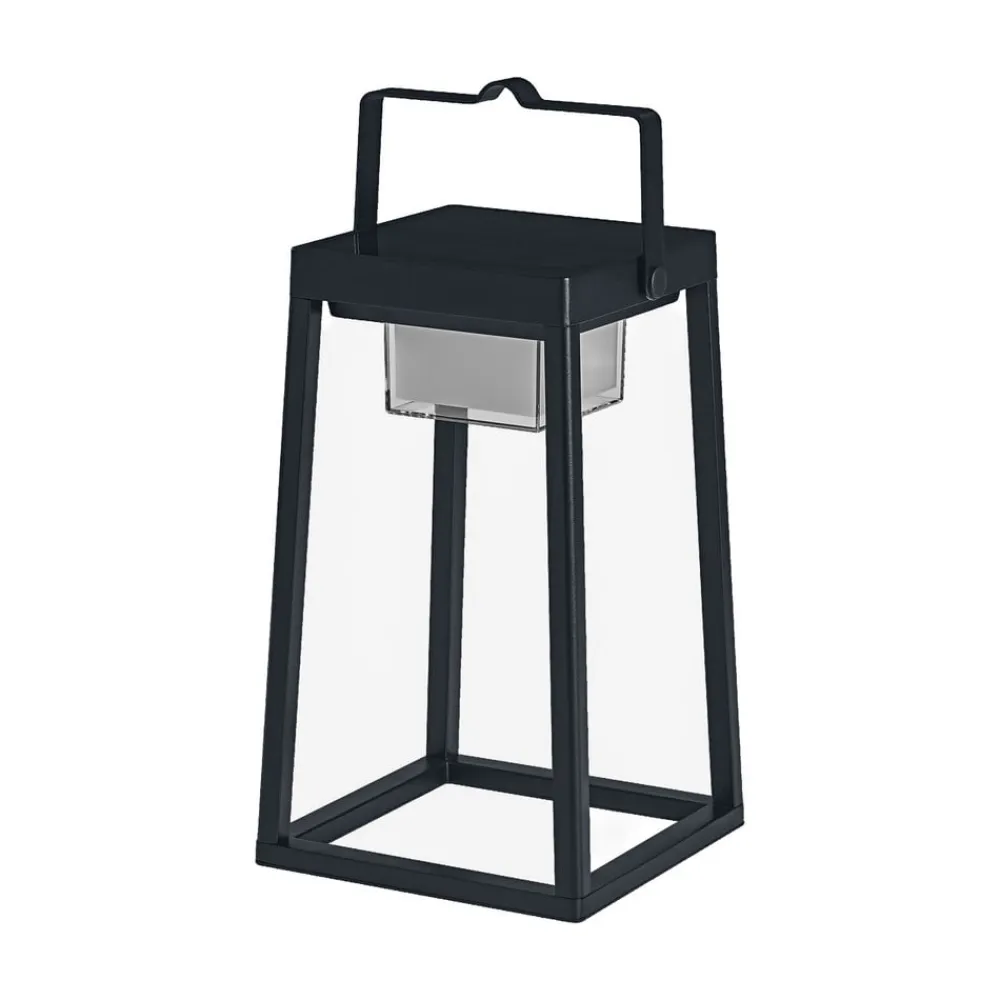 LED dekorativ lanterne Table Frame Solar Multicolor med genopladeligt batteri, solcellepanel og SMART Bluetooth-teknologiI haven, på terrasser og altaner og også på campingpladsen er den lanterneformede LED-solcelle lanterne Table Frame Solar Multicolor, som også kan hænges op, en velkommen lyskilde. Den kan lyse i både farvet og varm hvid belysning og kan styres via Bluetooth ved hjælp af en app på en tablet eller smartphone. Desuden er der indbygget et solpanel i toppen af lygten, så det integrerede batteri kan oplades i sollys. Alternativt kan batteriet også oplades via det medfølgende opladningskabel (opladningstid ca. 5 timer).- Ca. 16 millioner farvemuligheder eller varmt hvidt lys (3.000 K) kan indstilles- Dæmpbar- Styring via LEDVANCE SMART Bluetooth-appen, gratis til Android eller iOS- Stemmestyring via Amazon Alexa eller Google Assistant mulig- Integreret powerbankfunktion, f.eks. til smartphones