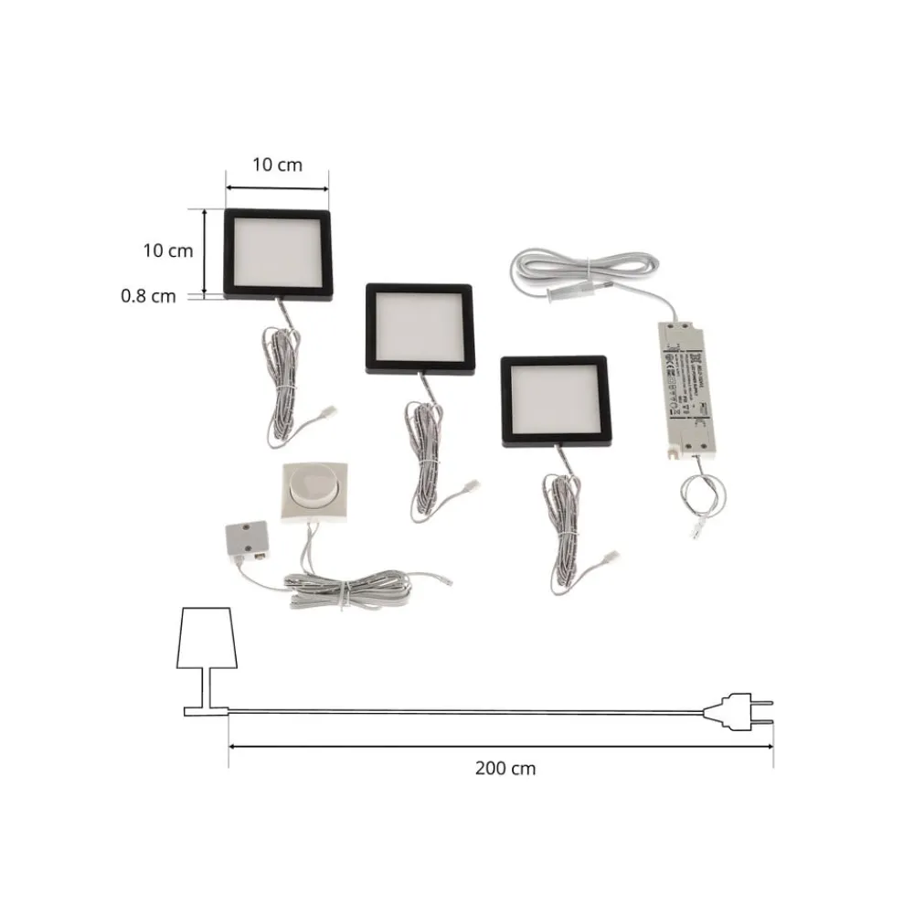 Dæmpbar LED-underskabsbelysning Antony med farveskiftfunktion LED-underskabsbelysningen Antony er designet i en moderne stil og imponerer med sin geometriske form. Det firkantede hus i helt sort passer godt ind i forskellige indretningsstile og fanger ikke umiddelbart øjet. Denne slanke lampe kommer i et praktisk sæt med 3 stk. og giver tilstrækkelig belysning, som f.eks. kan bruges over en køkkenbordplade. Alternativt kan lyset også bruges til at fremhæve et møbel i stuen på en attraktiv måde. Den integrerede drejekontakt gør det nemt at betjene lyset. De permanent installerede LED-moduler kan dæmpes, og lysfarven kan ændres fra varmhvid til dagslys. Antony LED-underskabsbelysning er derfor velegnet til enhver situation.
