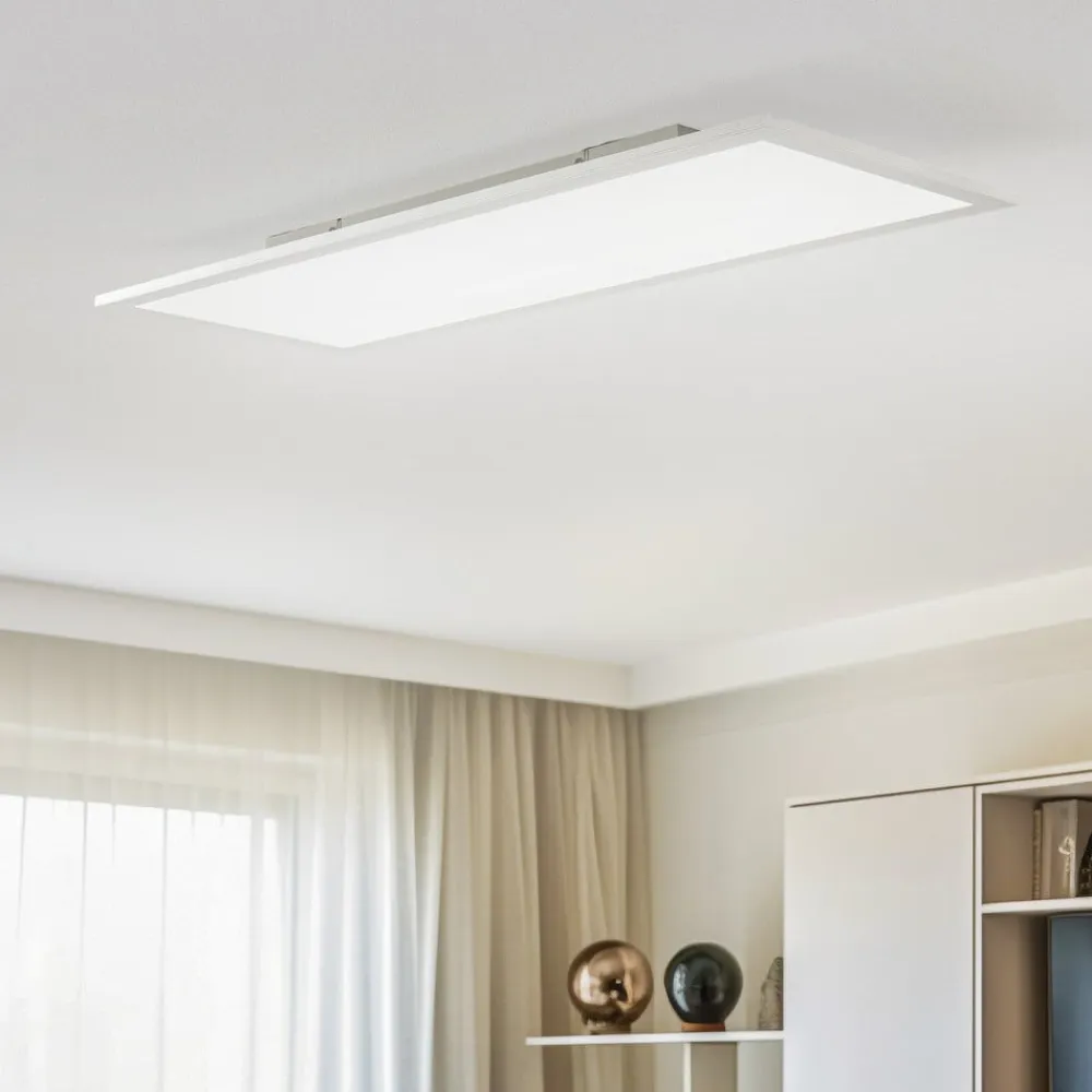 Lysstærk LED-loftlampe Livel med variabel lysfarve og individuelt justerbar lysstyrke Når Livel lyser med fuld lysstyrke, giver den et skarpt lys, der er velegnet til mange formål. Takket være PMMA-afdækningen er lyset ensartet og behageligt. Lysstyrken kan også dæmmes med den medfølgende fjernbetjening. Livel er også en loftlampe, hvis LED’er kan ændre lysfarven. Du kan også bruge fjernbetjeningen til dette og kan indstille et varmhvidt lys, vælge universalhvidt lys eller endda lade Livel skinne i lysfarven dagslys. LED-loftlampen er med sin aflange panelform en fremragende lyskilde til arbejdspladser og kontorer, men kan selvfølgelig også bruges i opholdsrummet, hvis man ønsker et funktionelt udseende. Ved brug af fjernbetjeningen er der integreret en hukommelsesfunktion, så de sidst gemte indstillinger kan hentes frem, næste gang lyset tændes. Lysfarven kan også justeres i tre trin (2.700 K, 4.000 K, 6.500 K) ved hjælp af den almindelige vægkontakt.