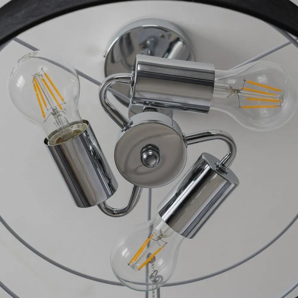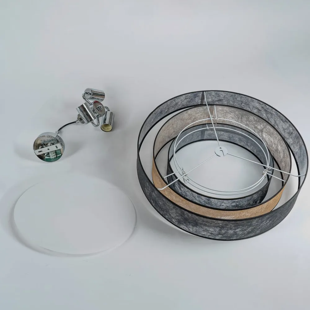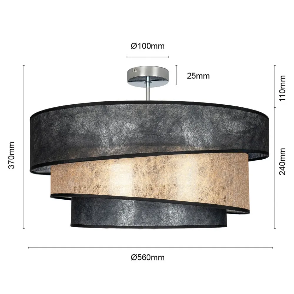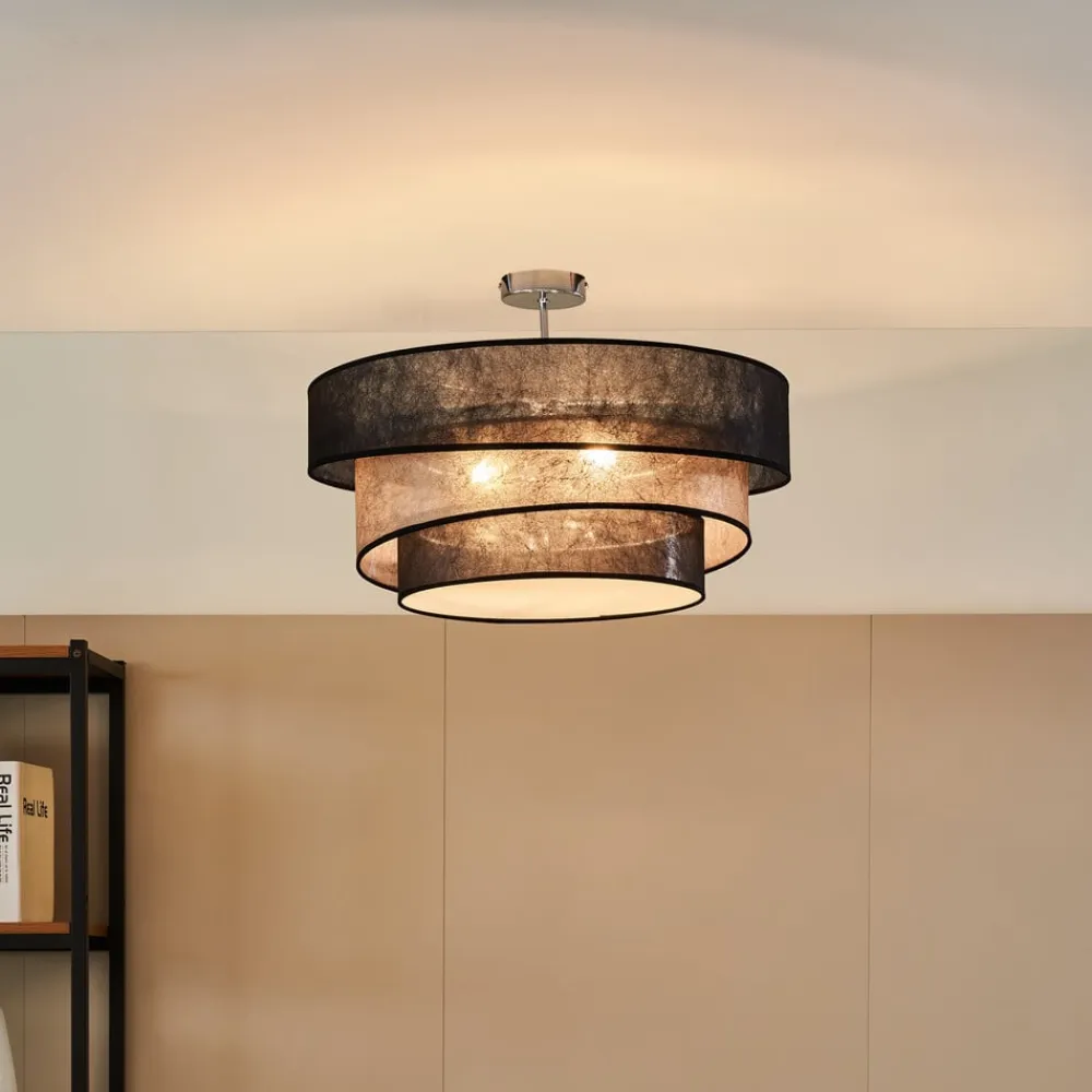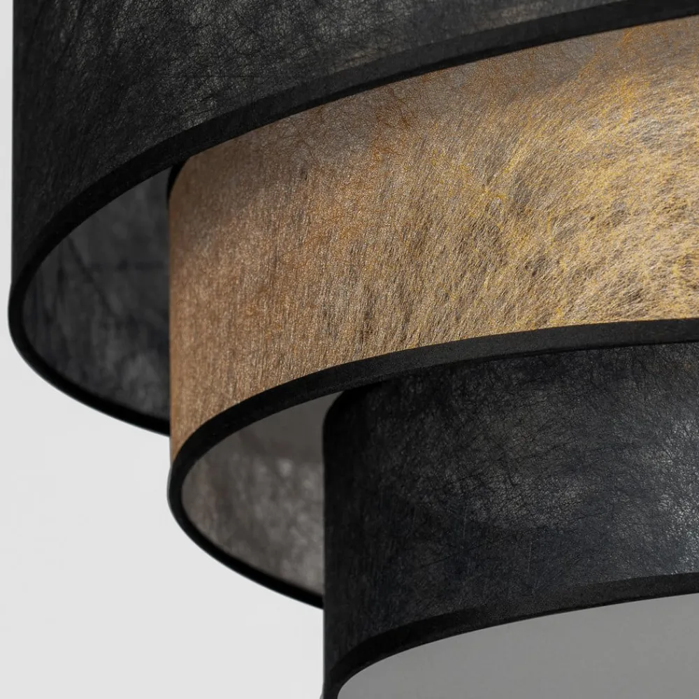 Sort-guld loftslampe Ayvira med en flerlags lampeskærmLoftlampen Ayvira ser meget moderne og elegant ud på loftet. Den er kendetegnet ved sin usædvanlige lampeskærm, som består af i alt tre lag. Skyggeelementerne er asymmetrisk udformet og veksler mellem sort og gylden farve. Dette giver armaturet en stilfuld farvekombination, der gør armaturet til et ægte blikfang på loftet i et moderne miljø, selv når lyset er slukket. Det ser meget flot ud i både stuen og soveværelset.