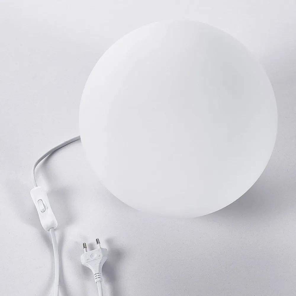 Hvid sfærisk Marike bordlampe Marike er en glasbordlampe med et tidløst look. Strengt taget ser man kun en hvid glaskugle, der danner skærmen, da der ikke er nogen iøjnefaldende base til at supplere helheden og også henlede opmærksomheden på den. Bordlampen er således indbegrebet af tidløs purisme, netop fordi kuglen er en form, der er universelt anerkendt og altid opfattes som stilfuld og elegant. Hvis du er på udkig efter stemningsfuldt lys på et natbord, en kommode, en vindueskarm eller et sidebord, bør du se nærmere på Marike, for med sin hvide glasskærm skaber den et meget harmonisk lys med en ensartet karakter, der opfordrer dig til at læne dig tilbage og slappe af.