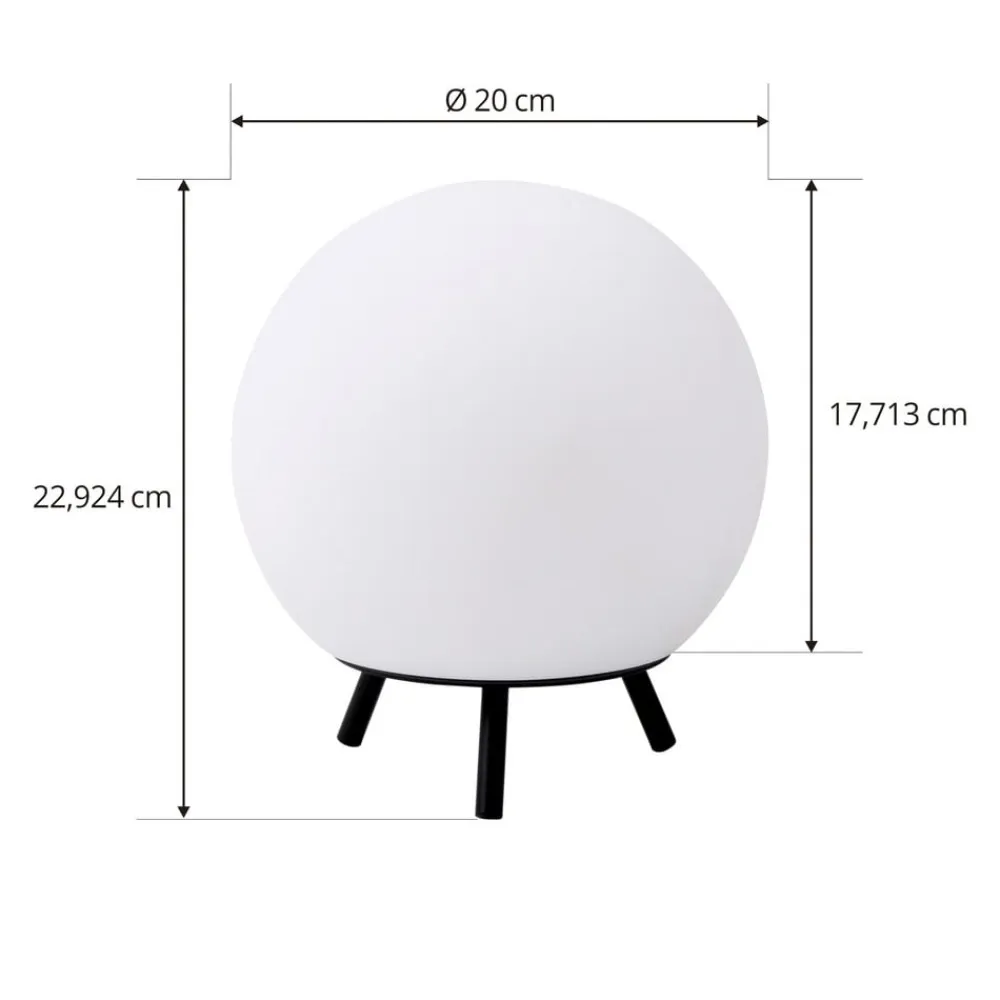 Aurilia sfærisk LED-bordlampe – batteridrevet LED-terrasselampen af jern og plast er et stilfuldt og moderne tilbehør til dine udendørsarealer. Den sfæriske skærm af plast giver diffus belysning og giver din have eller terrasse en behagelig atmosfære. Lampen er udstyret med en dæmpningsfunktion, så du kan justere lysstyrken efter behov og skabe en hyggelig atmosfære. Installationen af LED-terrasselampen er enkel og ligetil. Aurilia drives af et genopladeligt batteri, som oplades ved hjælp af det medfølgende USB-DC-kabel – inkl. USB-DC-kabel – inkl. 2.000 mAh Li-ion-batteri – batterilevetid 8 timer – flertrins dæmpningsfunktion via en kontakt på huset (25 %, 50 %, 75 % og 100 %)