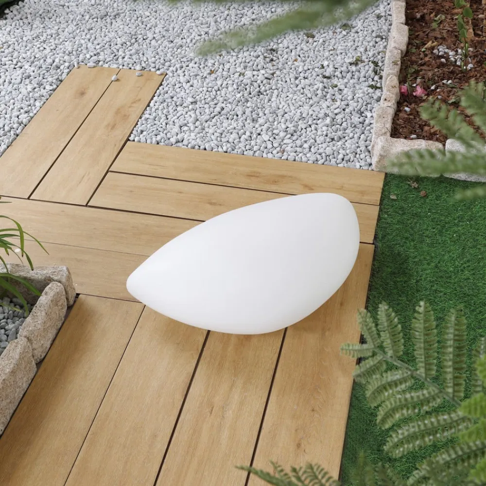Udstyret med et stik – Arani udendørs dekorationslys til jorden Arani udendørs dekorationslys passer diskret ind i havedesignet eller terrassen. Når den er slukket, kan den opfattes som en sten takket være sin enkle, afrundede form. Den er helt hvid og fremstillet af robust, slidstærk plast. Det er ikke den eneste grund til, at den er ideel til udendørs brug – takket være IP65-klassificeringen kan den modstå vandstråler og støv. Så snart den er tændt, udsender den et ensartet, blændfrit lys. Arani er udstyret med to E27-pærer. Den tilsluttes nemt til den nærmeste stikkontakt ved hjælp af Schuko-stik og kabel.