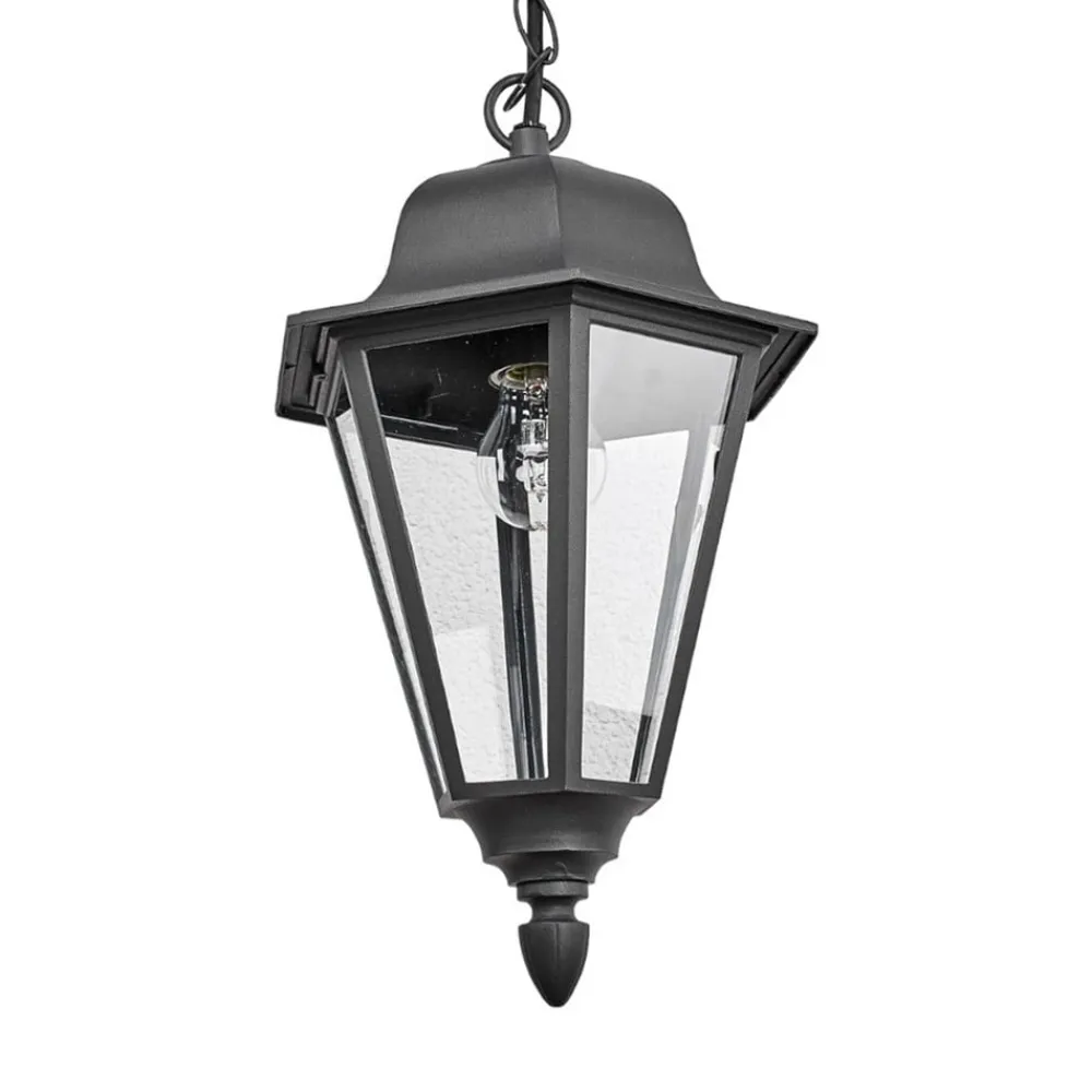 Antracitfarvet Edana hængelampe til udendørs brug Når man ser på Edana, bliver man straks mindet om de lygter, der var den vigtigste form for belysning i tidligere århundreder. Det giver hængelampen et nostalgisk præg, og derfor ser Edana også ud til at passe smukt ind i historiske bygninger. Overfladen er en tidløs antracitfarve, og Edana er designet som en udendørs hængelampe, der kan monteres med E27-pærer. Det betyder, at det ikke kun er de velkendte glødepærer eller halogenpærer, der kan bruges her, men de, der ønsker det, kan også bruge LED-pærer, som bruger meget lidt energi og nogle gange er designet, så de til forveksling ligner en glødepære.