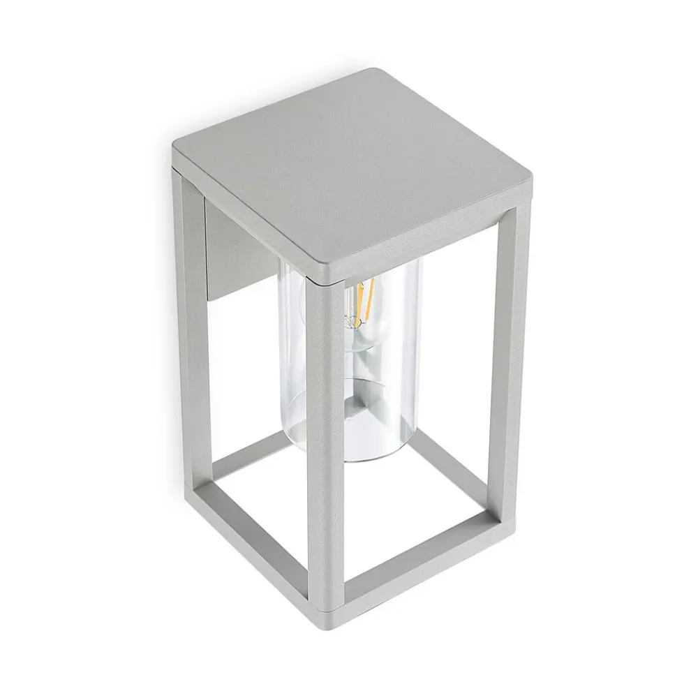 Estami udendørs væglampe i sølvgråt design Estami udendørs væglampen imponerer med sit enkle og moderne look. Den er fremstillet af aluminium og har en neutral sølvgrå finish, der gør den nem at integrere i forskellige miljøer. Huset har en åben burform med en cylinderformet plastikskærm indeni. Lyspunktet er tydeligt synligt takket være den gennemsigtige skærm, og derfor anbefales en dekorativ pære her.