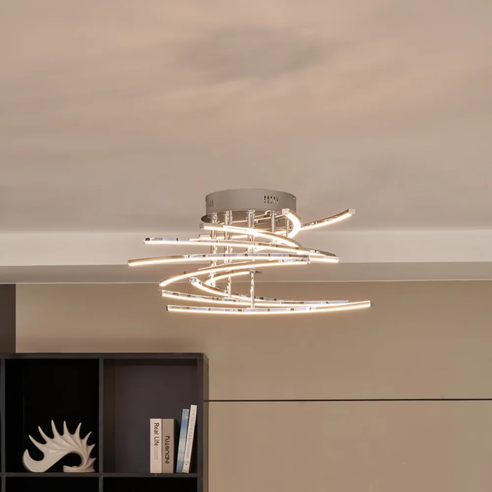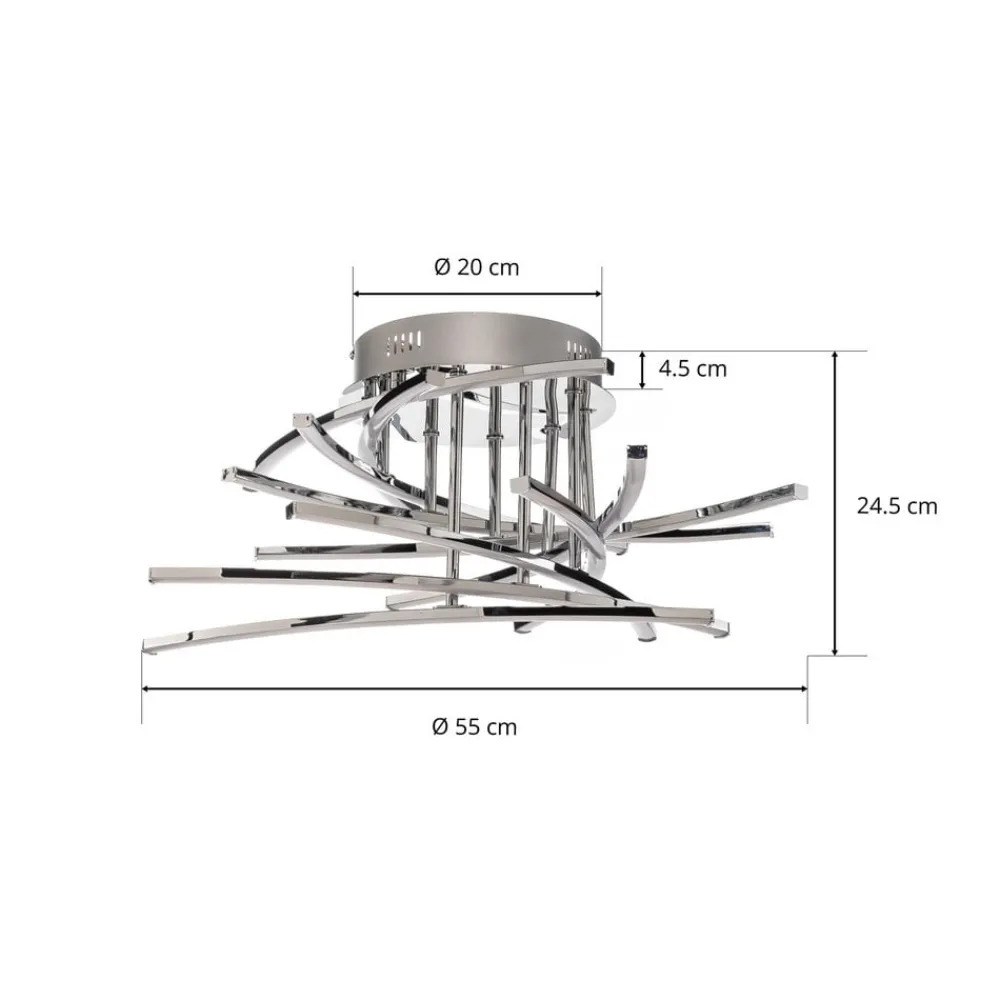 Solformet Flakira LED-loftlampe i krom, dæmpbar i tre trin via lyskontakt Skab flotte lysaccenter med Flakira LED-loftlampen, og giv dit interiør et særligt præg. Muligheden for at dæmpe (100 %, 40 %, 10 %) sikrer fleksible lysforhold og en hyggelig feelgood-atmosfære ved hjælp af en lyskontakt. Lampen udsender en behagelig varmhvid lysfarve for at skabe en følelse af velvære. Loftlampen er med sit moderne design perfekt til din spisestue, stue eller indgangsparti. I Lindby-mærkekvalitet står lampen i farven krom for en overbevisende boligfølelse og gennemtænkt design. Det smukke lysspil fra loftlampen skaber en hyggelig stemning, hvor man føler sig godt tilpas.