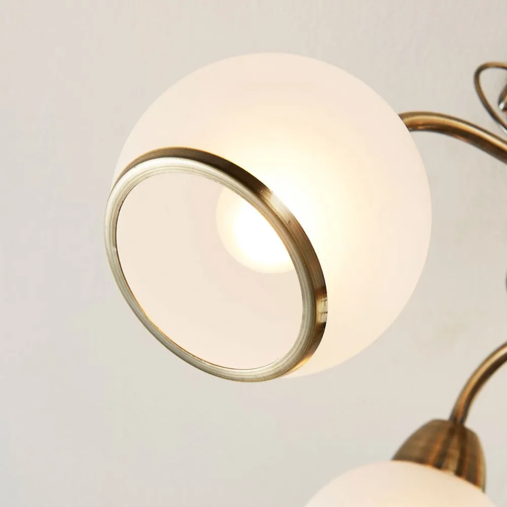 Fortryllende Corentin loftlampe med smukke sfæriske skærme Den, der foretrækker en klassisk atmosfære med et romantisk look og leder efter en passende loftlampe til dette, bør tage et kig på Corentin, for den ser virkelig bare magisk ud, og den romantiske effekt er svær at overse! Det skyldes ikke mindst de gamle messingfarvede metalranker, der supplerer rammen mellem skærmene og loftbeslaget. Lyset er meget jævnt, og derfor skabes der en hyggelig karakter i rummet, når loftlampen er tændt.