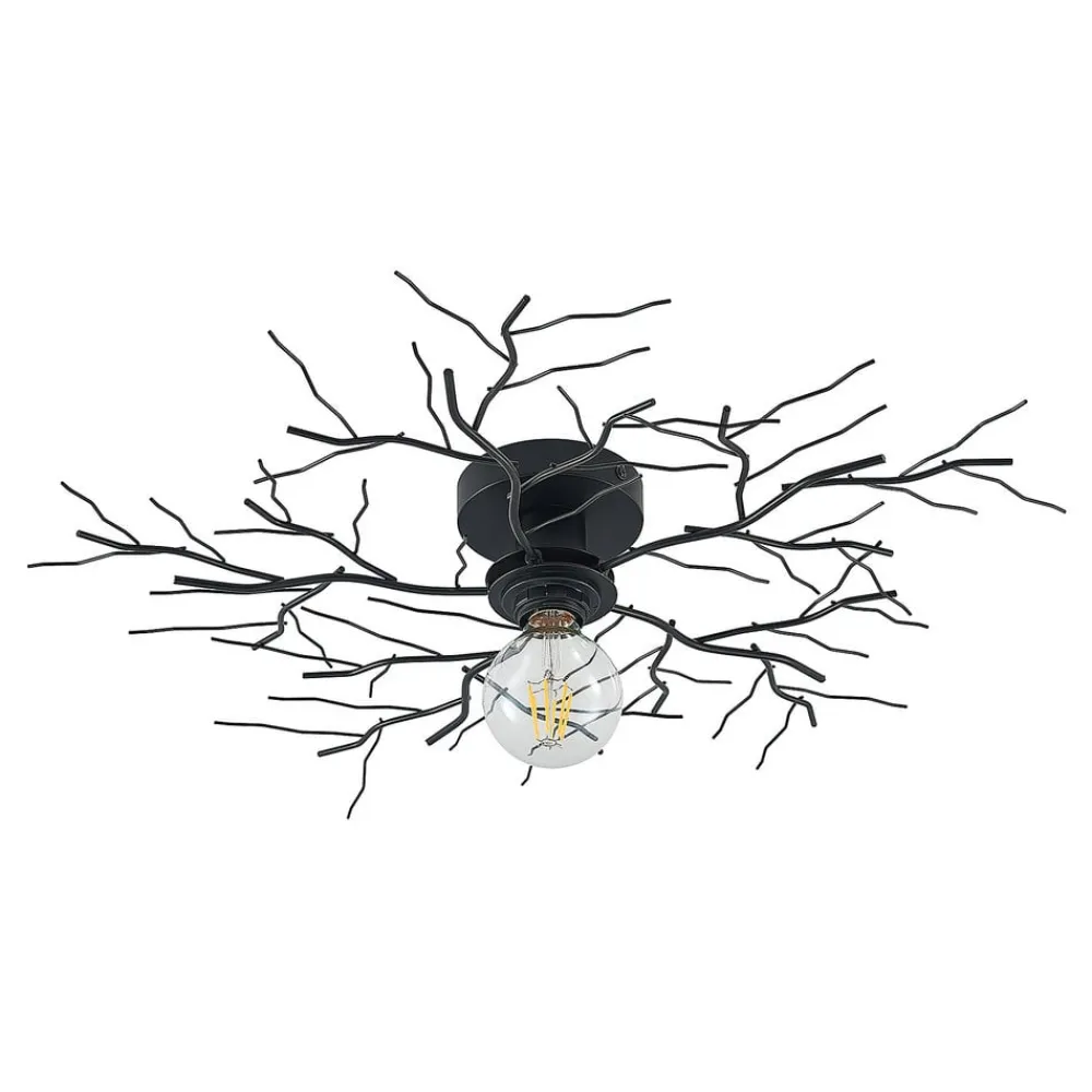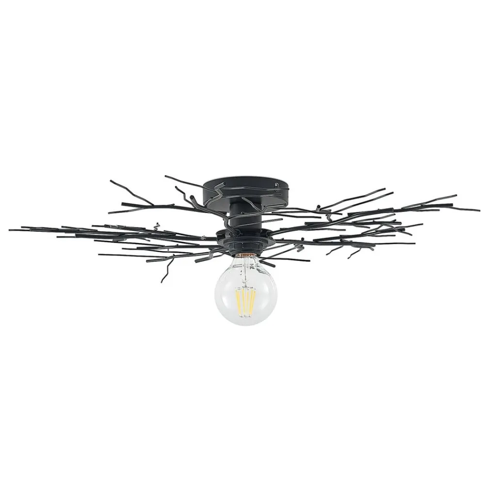 Vetki loftlampe i et usædvanligt design Denne smukke loftlampe imponerer med et særligt look, der er umiddelbart tiltalende. Man har undladt en klassisk lampeskærm, så man har frit udsyn til den pære, der skal bruges. Derfor skal den vælges med omhu og understrege armaturets dekorative karakter. Fokus i dette design er den fremspringende jerndekor, som minder om mange forgrenede grene i en abstrakt form og dermed bringer et naturligt element til dette armatur.