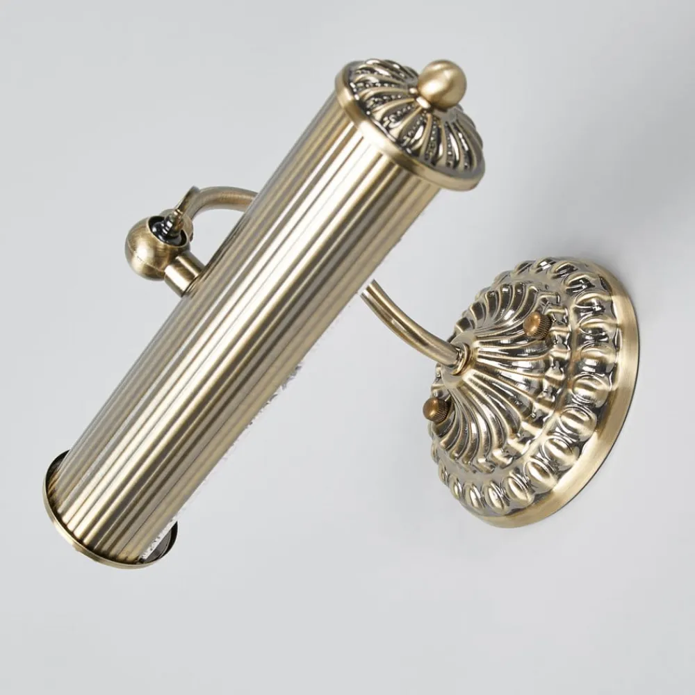 Antikt udseende gallerilampe Joely med detaljeret look Joely har en nostalgisk udseende antik messingoverflade og er prydet med mange detaljer, der passer smukt ind i det overordnede design. Gallerilampen er en god tilføjelse til klassisk indrettede stuer og kan også stilfuldt fremhæve og belyse dit yndlingsbillede – hvad enten det er et maleri, en tegning, et fotografi eller et kunsttryk.