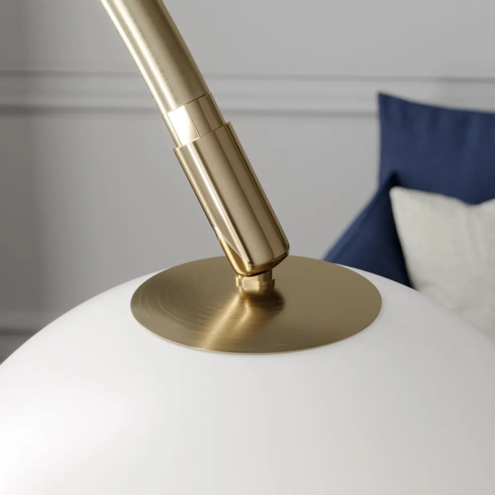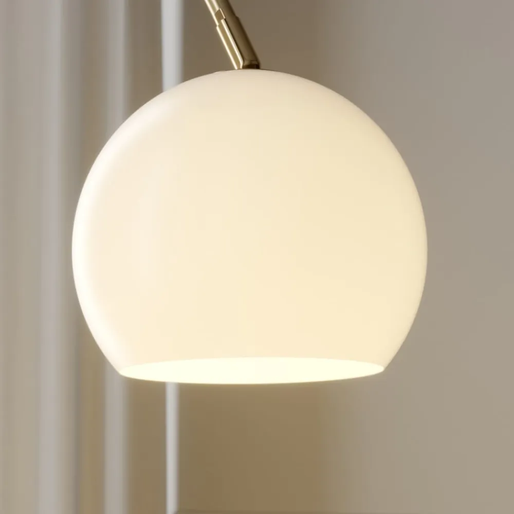 Messingfarvet buelampe Cynthia med hvidt glasskærm