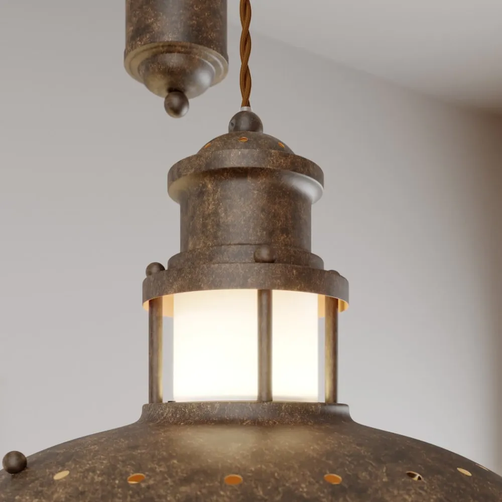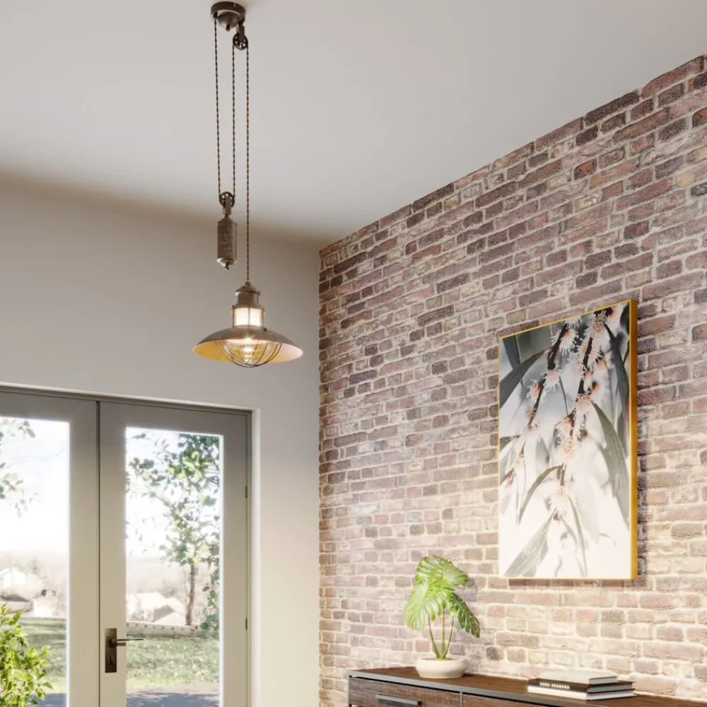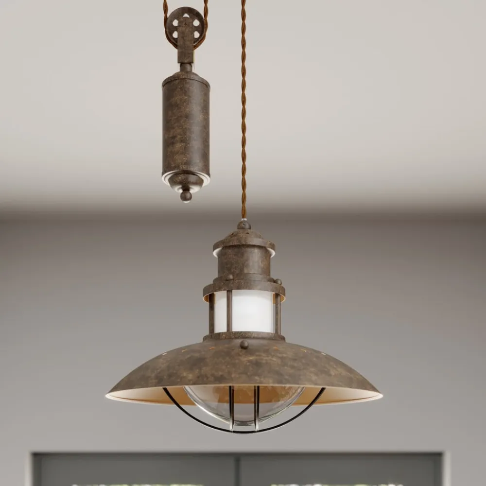 Denne pendellampe er udstyret med et højdejusterbart rebtræk, der gør det muligt at indstille højden individuelt. Lampen kan trækkes ned i rummet til maksimalt 240 cm. Den runde metalskærm har en brun lakering, der giver et rustikt udtryk og passer godt til landlige stilarter. Skærmen suppleres af et element af klart glas, og dens udseende minder lidt om maritime lamper. Højdejusterbar mekanisme gør lampen ideel til brug over et bord, for eksempel i køkkenet.