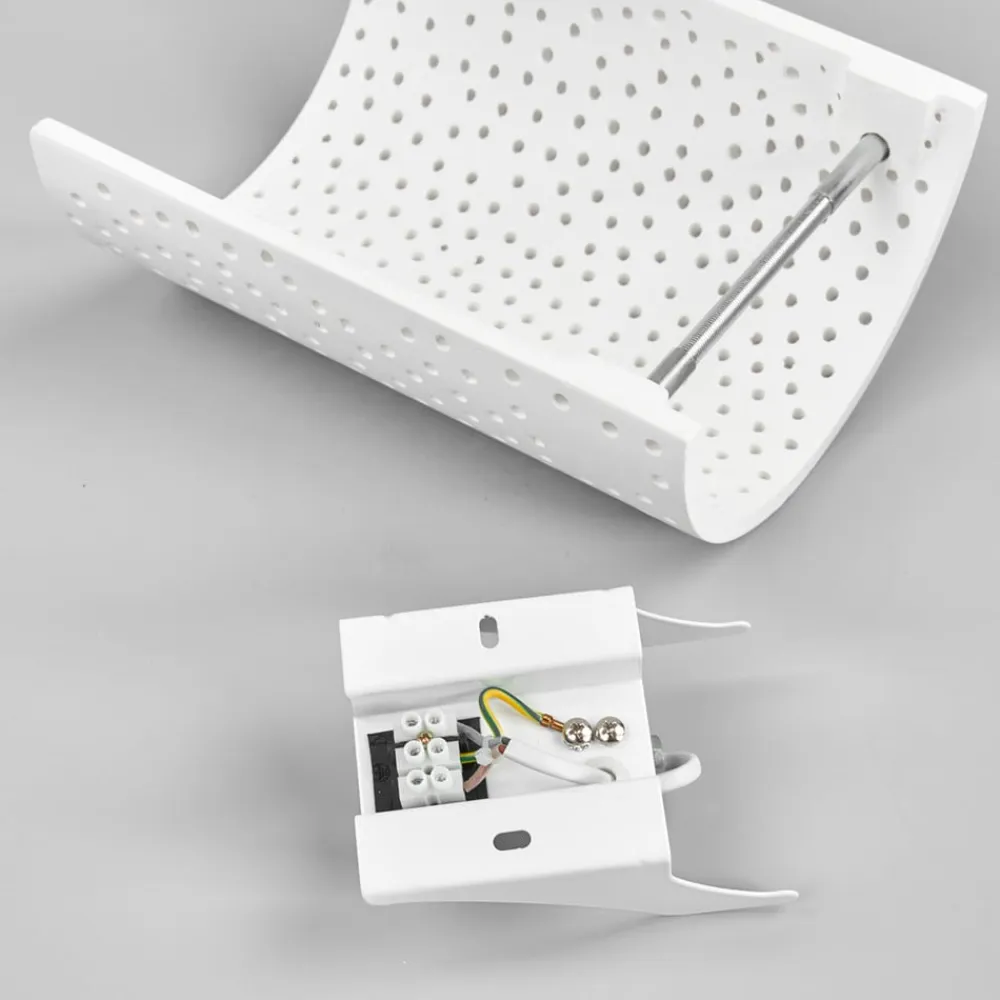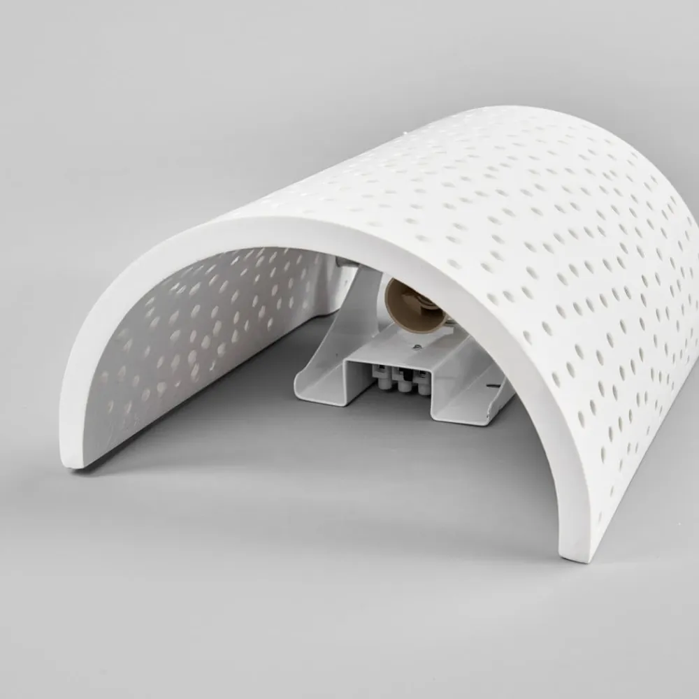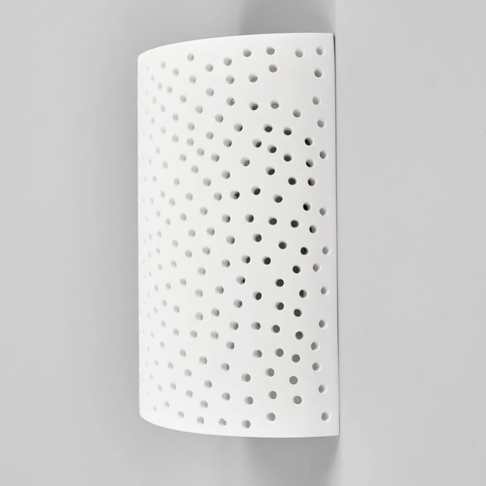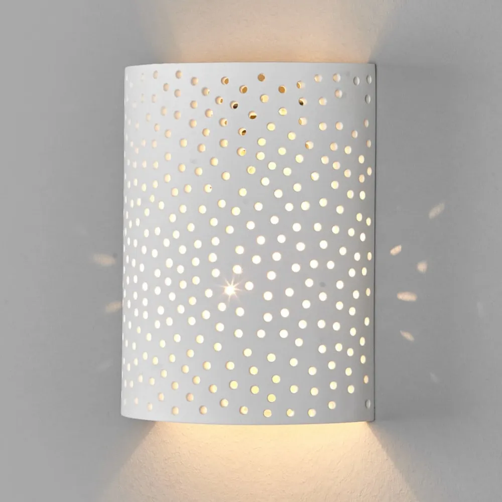 Jiru væglampe af gips med dekorativt hulmønster Skærmen på denne væglampe af gips er blidt buet som en skærm, og det meste af lyset slipper ud opad og nedad. Men da gipsoverfladen ikke er gennemgående, men har utallige små huller, som tilsammen skaber et smukt hulmønster, kan der også slippe noget lys ud her, og man kan se en vidunderlig gnist af mange lyspunkter, som kunstfærdigt bryder igennem skærmen. Jiru-væglampen er derfor særligt velegnet til ekstra- eller accentbelysning, da fokus naturligvis ikke er på stærk belysning, men på en stemningsfuld effekt.