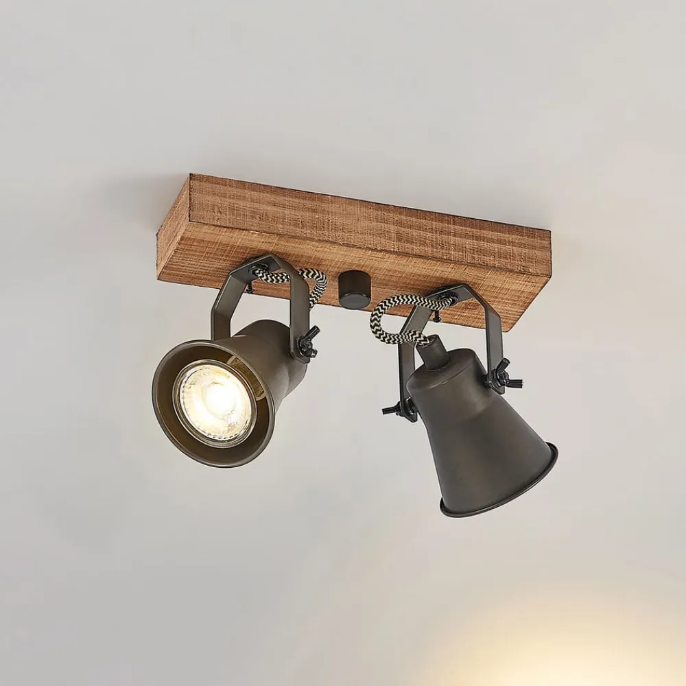 Det træ baldakin af Grandesa loftlampe er udstyret med to projektører. Disse sidder i beslagsholdere, som de kan drejes med og drejes for at lede lysstrålingen ind i et bestemt område. Kombinationen af træ i et flammet look og sortlakeret metal gør spotlighten til en lyskilde i et vintage design, der kan bruges på mange måder.