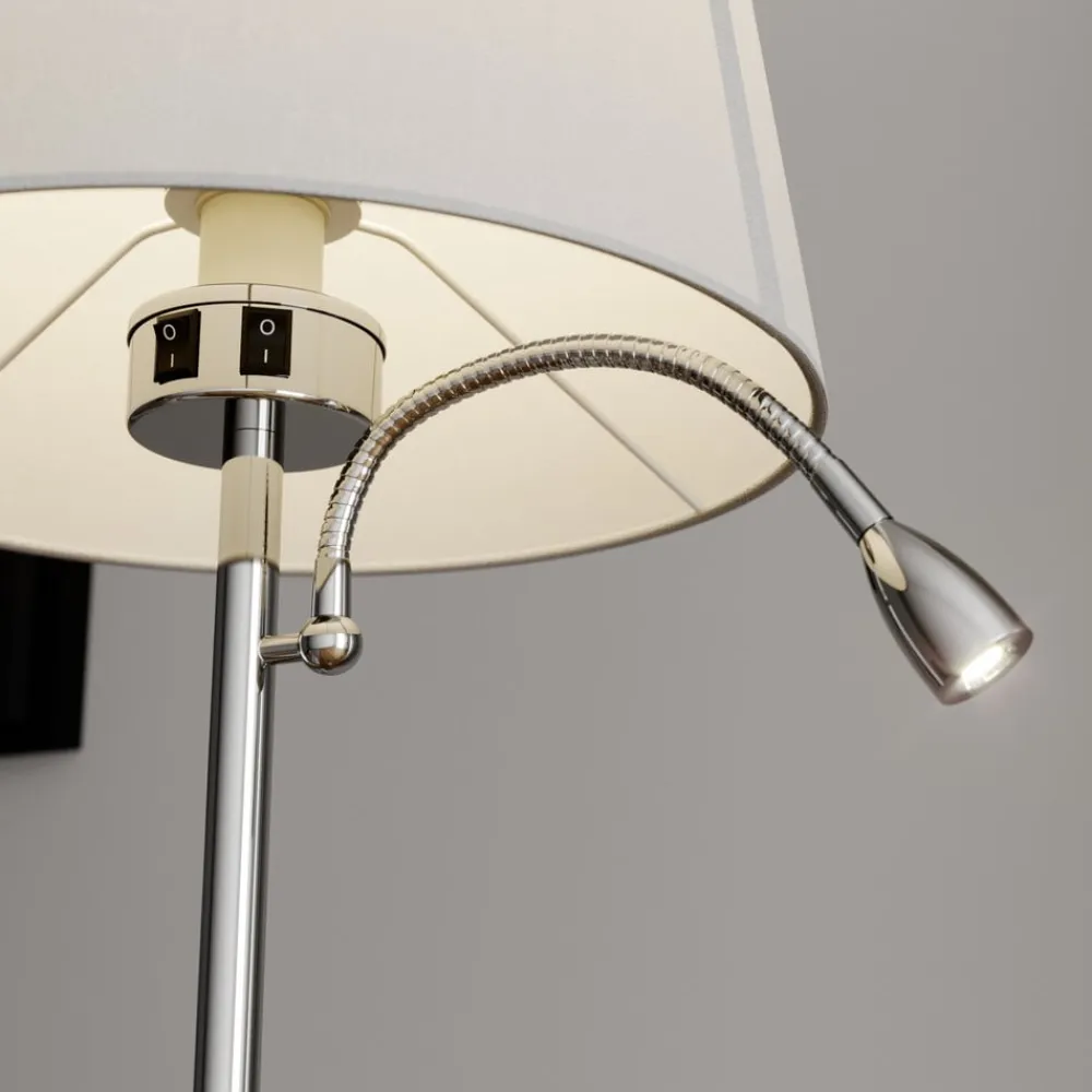 Rund Benjiro gulvlampe med hvid stofskærm og integreret LED-læselampe Denne gulvlampe er et meget nyttigt belysningsobjekt til stuer og soveværelser, der scorer med en hyggelig lyseffekt. Den skabes af stofskærmen med hvid overflade, som lader lyset trænge varmt og blødt ind i omgivelserne. Lige så dejligt et hyggeligt, diffust lys er, lige så meget savner man nogle gange belysning med en målrettet glød. Til dette formål er Benjiro gulvlampe udstyret med en ekstra LED-læselampe, som er forbundet med stellet via en fleksibel arm og kan flyttes efter behov. Gulvlampen har to vippekontakter i nærheden af pæreholderen til separat betjening af de forskellige lyskilder.