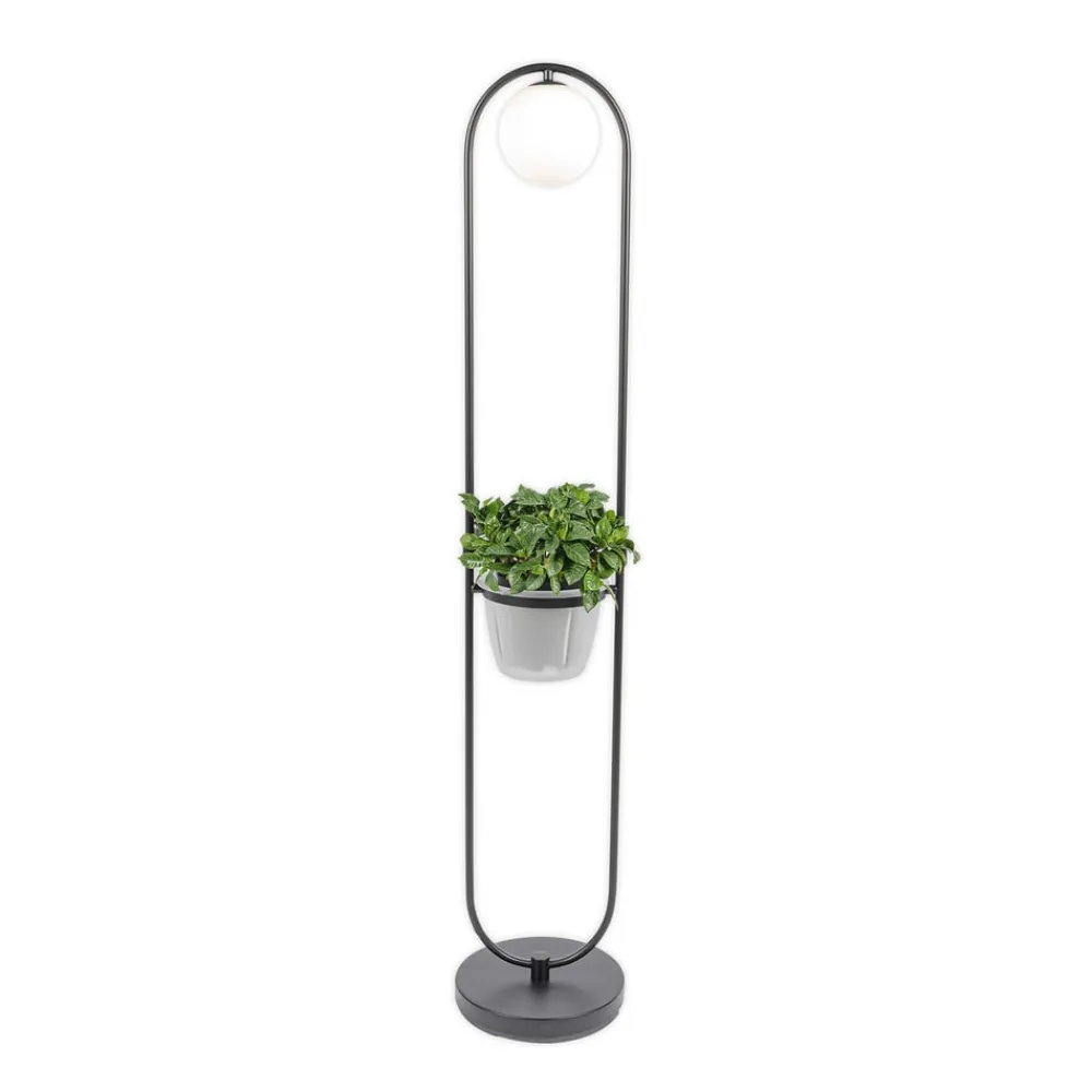 Attraktiv gulvlampe Orna med integreret urtepotteDenne gulvlampe fuldender din indretning på en stilfuld måde. Du kan nemt tænde eller slukke gulvlampen ved hjælp af en lyskontakt. Lampen er udstyret med en G9-fatning. Denne gulvlampe kombinerer alle de kvaliteter og særlige egenskaber, der kendetegner Lindby-mærket. Gulvlampen er i farverne sort og opal. Med denne gulvlampe vil dine fire vægge blive endnu hyggeligere. Den blomsterkrukke, der er integreret i dens krop, kan plantes efter behov og bringer et lille stykke naturlighed til dit interiør.