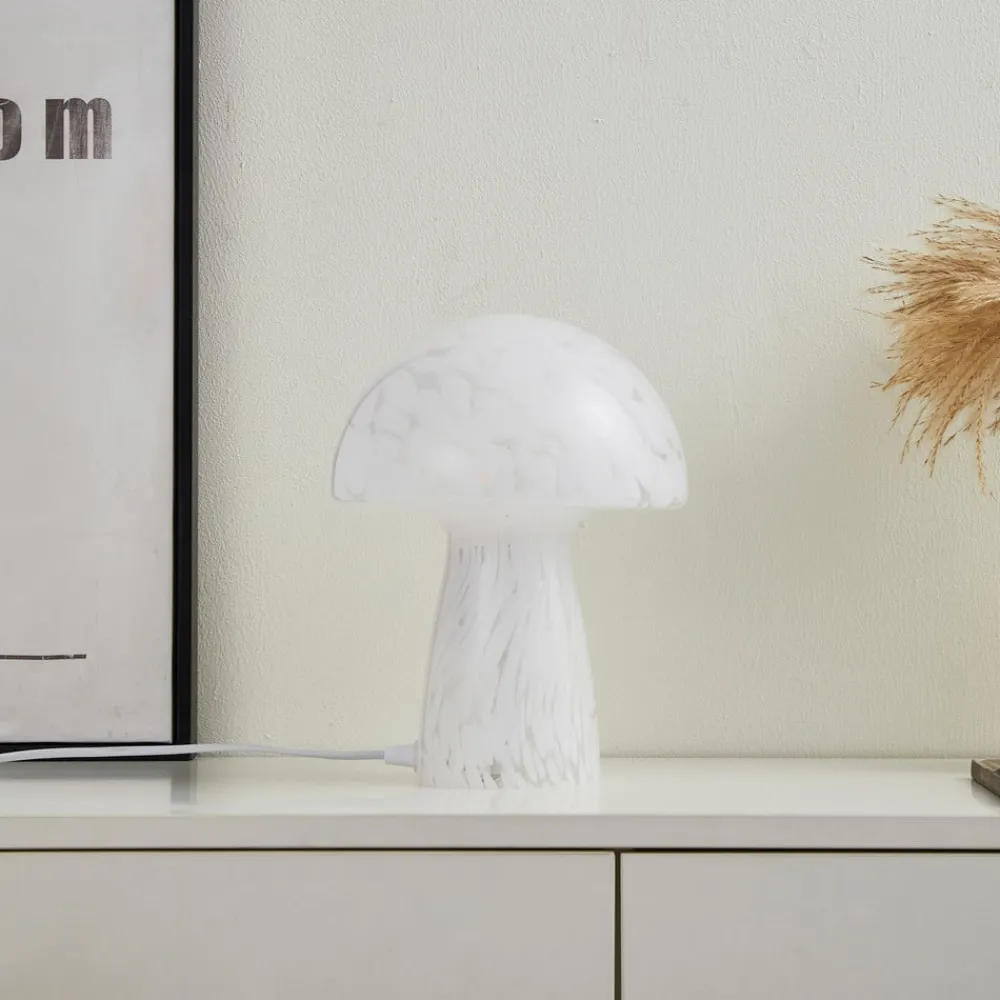 Lindby Hubi bordlampe, hvid, glas, Ø 22 cm, svampeform