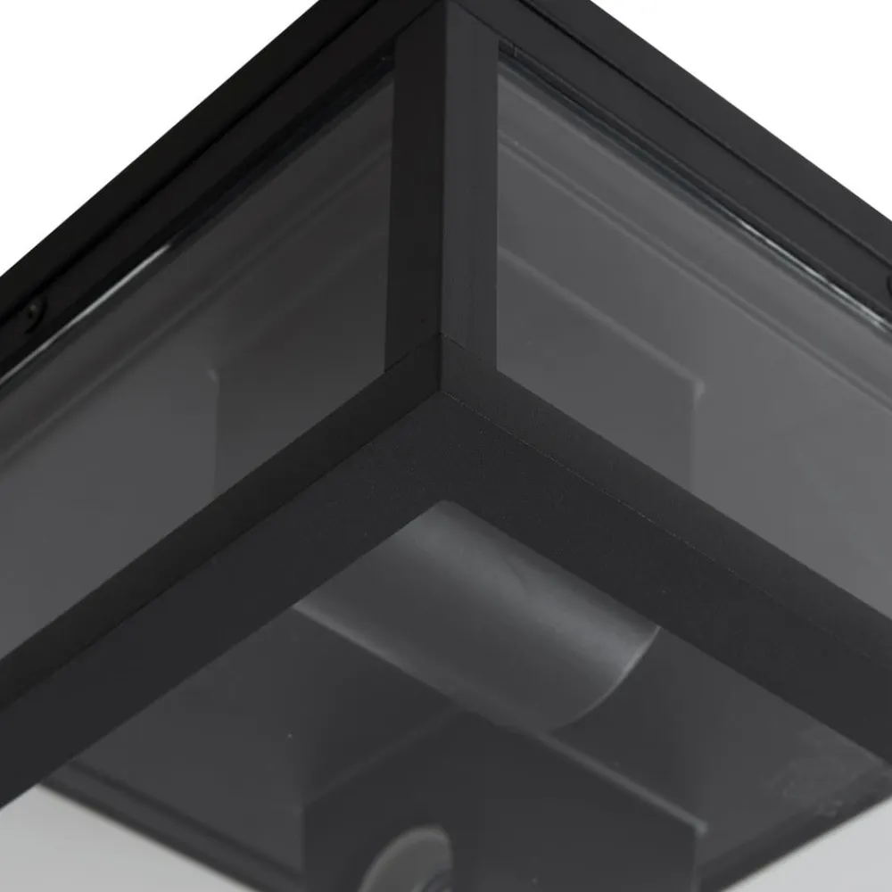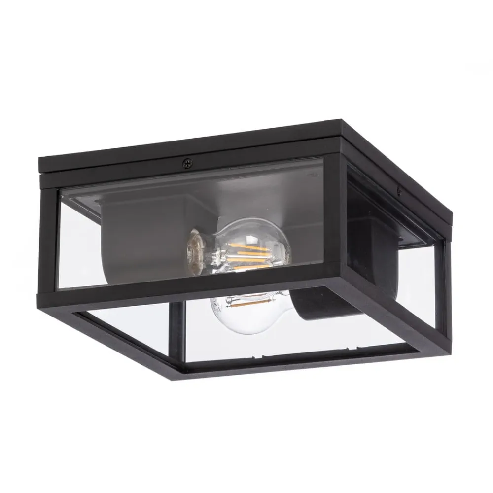 Kremena vinklet udendørs loftslampe af aluminium og glas Kremena loftslampen er en perfekt tilføjelse til den udendørs atmosfære. Den er lavet af aluminium og glas og har en kantet form. Der er to modstående fatninger indeni, som kan monteres med E27-pærer. Takket være IP44-beskyttelsesgraden er Kremena beskyttet mod vandstænk og er ideel til en overdækket terrasse. Glasset giver frit udsyn til lyskilden, hvilket gør det oplagt at bruge glødelamper – deres særlige udseende giver armaturet noget særligt.