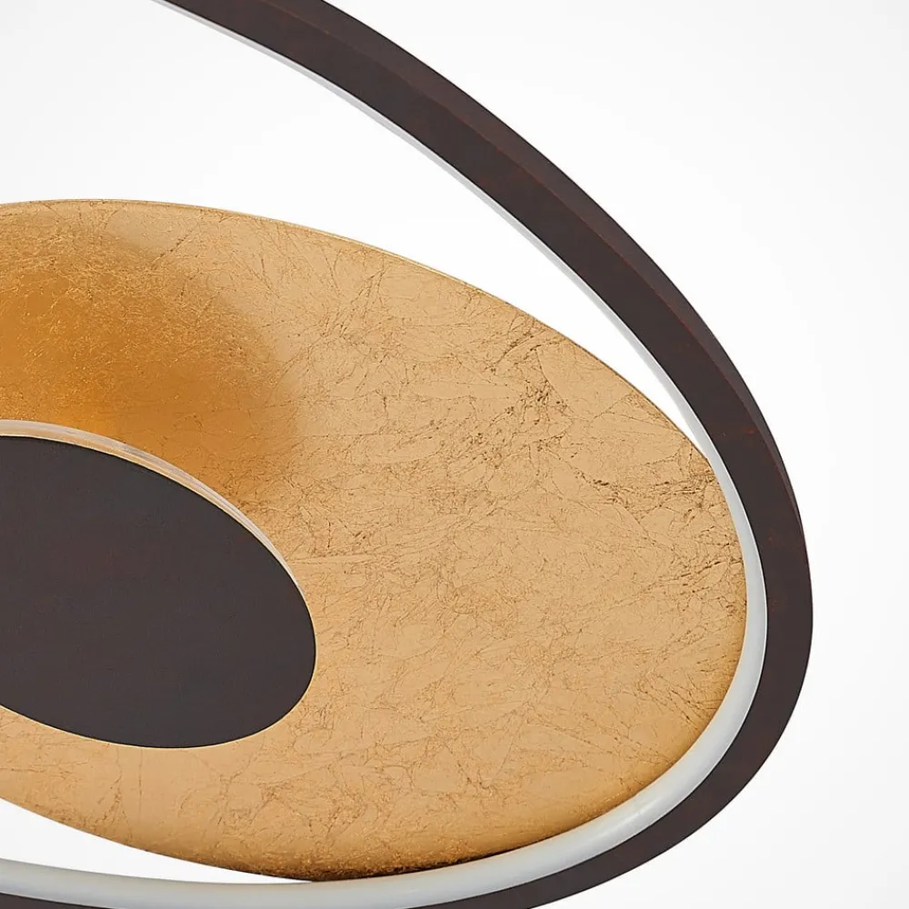 Dæmpbar Feival LED-loftlampe med gyldne elementer LED-loftlampen Feival består af en rund loftsplade i guld. Den er omgivet af en rustfarvet, smal ring i en oval form. Det får armaturet til at minde om planeter som Saturn eller Jupiter, som også er omgivet af en bane. LED’erne er placeret inde i ringen og bag det sorte dæksel. De skinner mod den gyldne lak og giver lyset en gylden glød. Desuden sendes noget af lyset ikke direkte ud i rummet. Den indirekte belysning giver en behagelig diskret belysning, som alligevel fylder hele rummet. Hvis det er nødvendigt, kan lyset dæmpes ved hjælp af en vægkontakt. 3-trins dæmpbar + off: Lyset kan tændes og slukkes som normalt ved hjælp af en vægkontakt. Takket være 3-trins-dæmpningsteknologien med integreret slukfunktion kan den også dæmmes til tre forskellige lysstyrkeniveauer ved at trykke på kontakten flere gange: 100 %, 50 % og 25 %.