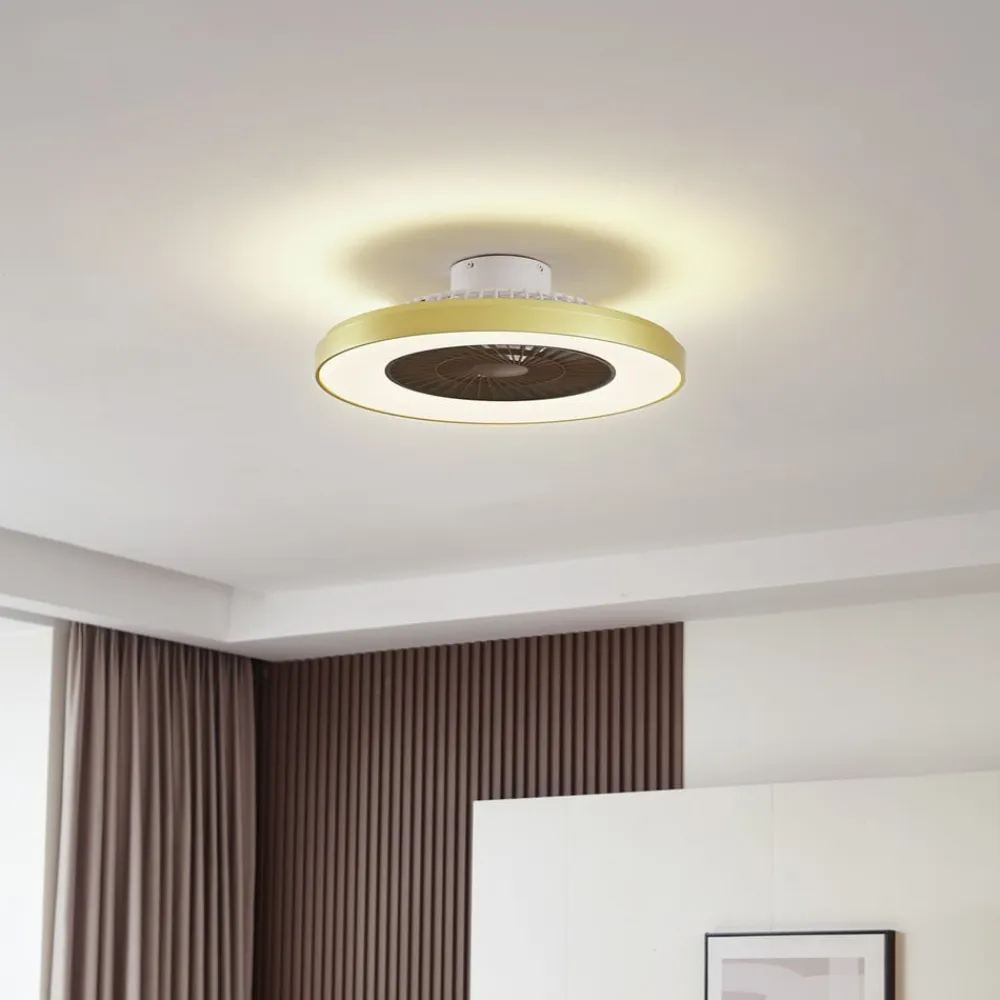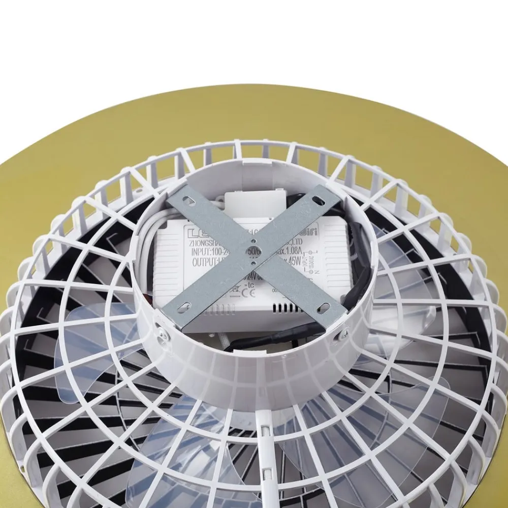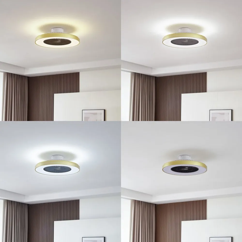 Den messingfarvede LED-loftventilator Teleo med CCT-funktion Oplev den harmoniske kombination af lys og luftbevægelse med LED-loftventilatoren Teleo. Dette moderne belysningselement, der er udstyret med en integreret LED-lyskilde, giver ikke kun effektiv belysning, men også en behagelig brise i ethvert rum. Den styrbare lysfarve (CCT) gør det muligt at justere lysfarven efter ønske – fra varme til kølige toner – og skabe den rette atmosfære til ethvert rum. Med sit stilfulde messingdesign er ventilatoren en elegant tilføjelse til stuen, spisestuen eller soveværelset. Den integrerede dæmpningsfunktion, som styres via den medfølgende fjernbetjening, giver dig mulighed for at justere lysstyrken individuelt og dermed tilpasse belysningen til dine behov. Tekniske data – 1000 o/min – effekt 19,2 watt – optimal rumstørrelse 10m² – lydstyrke 35 dB (A) – fjernbetjeningen leveres uden batterier – loftsventilatoren kan også styres via Tuya-appen (tilgængelig til iOS og Android)