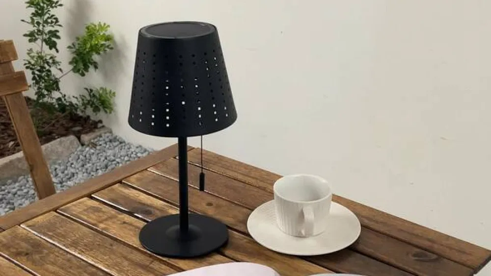 Dæmpbar Hilario LED-solcellebordlampe med trækkontakt Hilario LED-solcellebordlampen i sort design med perforeret skærm kombinerer stilfuld belysning med funktionel innovation. Lampen er specielt designet til udendørs brug for at forvandle altaner og terrasser til en stemningsfuld oase. Takket være den integrerede LED-lyskilde og solcelledrevne genopladelige batteriteknologi tilbyder Hilario en energibesparende belysningsløsning, der er helt fleksibel med hensyn til placering og ikke kræver noget kabel (genopladning via USB-kabel medfølger). Den integrerede dæmpningsfunktion gør det muligt at justere lysintensiteten trinvist efter behov og skabe den rette atmosfære til enhver situation. Uanset om det er til en afslappende læsesession udendørs eller en hyggelig sammenkomst – Hilario-bordlampen skaber en indbydende atmosfære med sit behagelige lys – monokrystallinsk silikonesolpanel – inkl. 18650 Li-Ion-batteri, 3,7 V, 2.200 mA – opladningstid 6 timer, med USB-kabel 6,5 timer