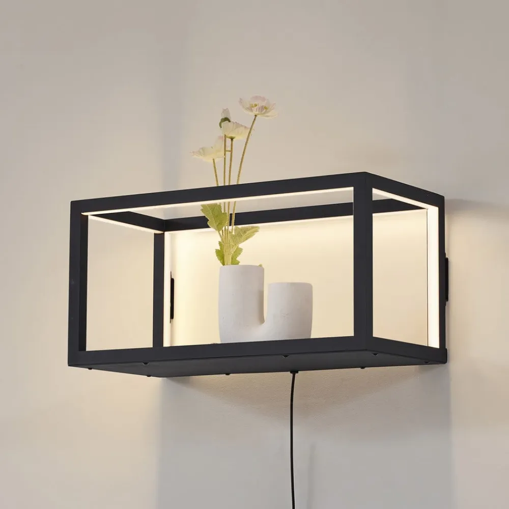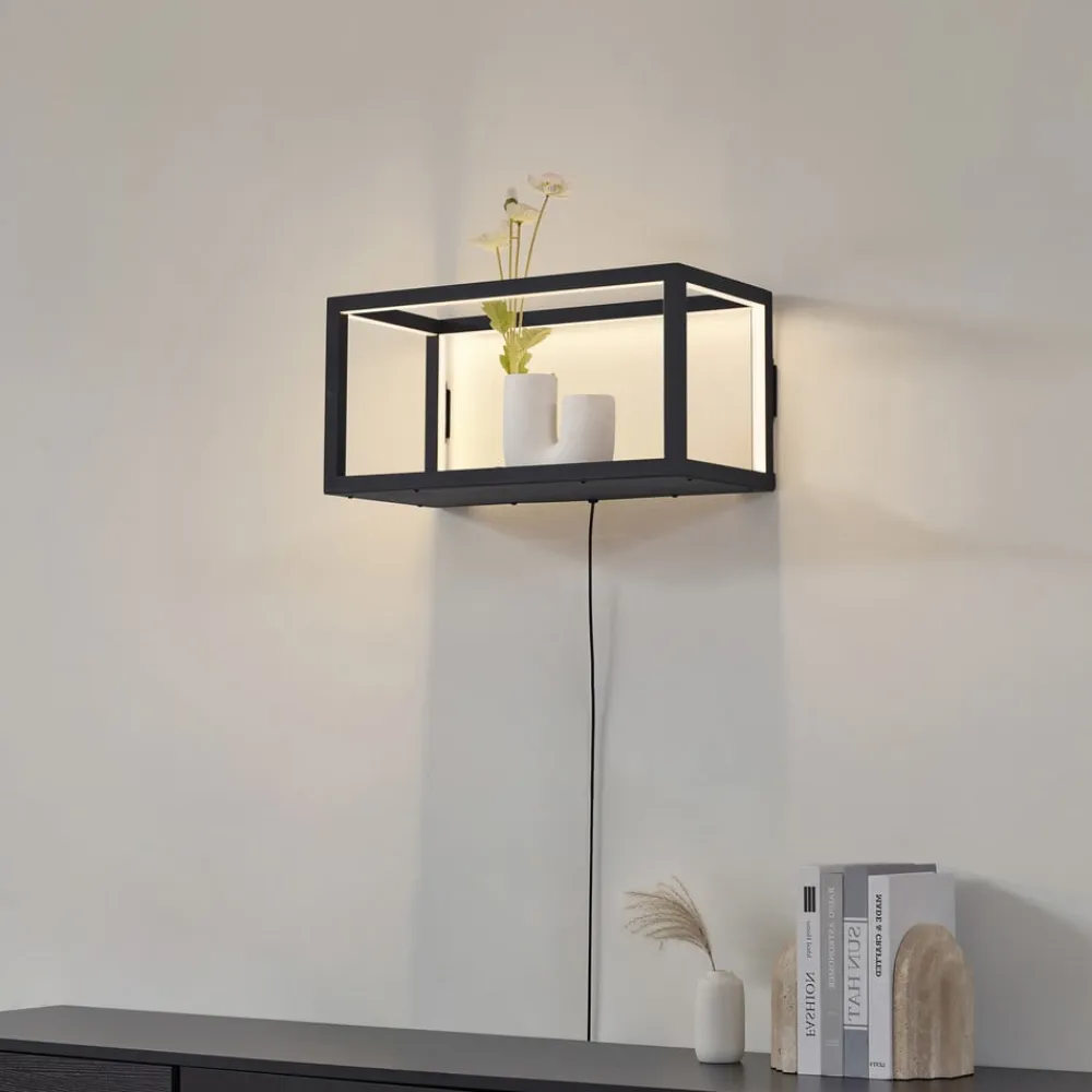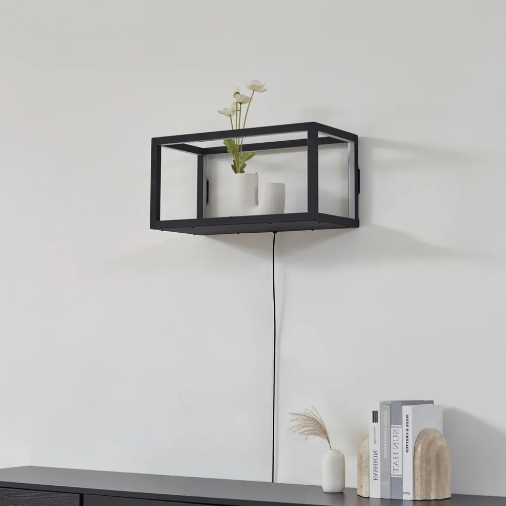 Med sin form minder væglampe Birta om en hylde og overbeviser med sin praktiske opbevaringsplads, der kan bære op til 3 kg. Den sorte ramme danner grundlag for de integrerede LED’er, der afgiver et varmhvidt lys.