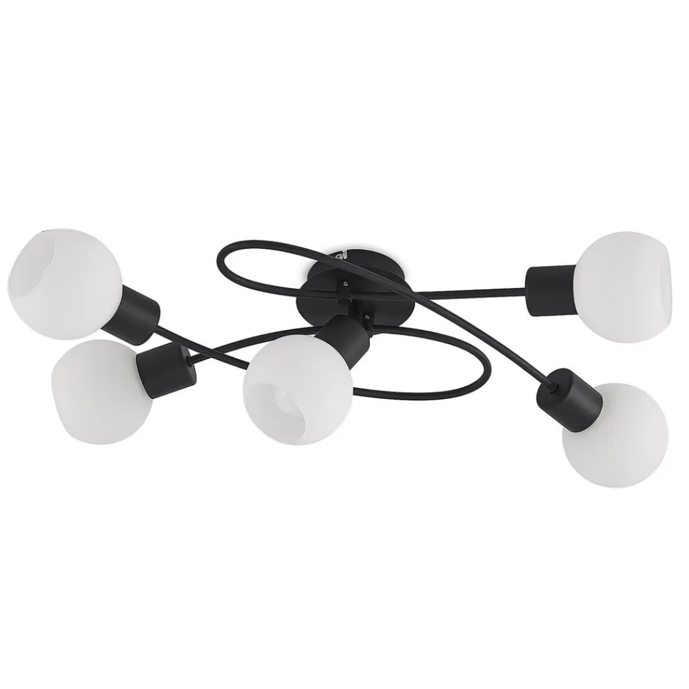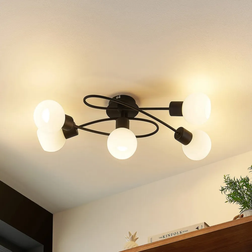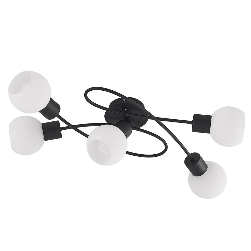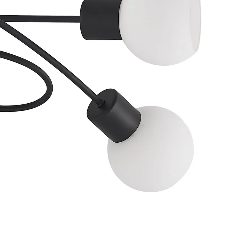 5 lyskilder Elaina loftlampe i sort og hvidt design Elaina loftlampen er en stilfuld følgesvend i hverdagen og kan også give tilstrækkelig belysning i større rum takket være sine fem lyskilder. Det robuste jernstel har en sort overfladefinish, mens de halvkugleformede lampeskærme danner en stilfuld kontrast med deres opalhvide farve. Lampeskærmene fordeler lyset jævnt og uden blænding i hele rummet. Lampens moderne koncept gør den ideel til forskellige rum og indretningsstile.
